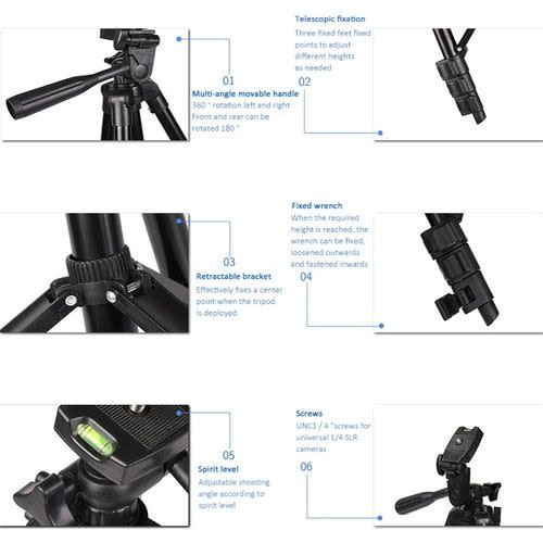 The tripod stand comes with a pan head, designed for outdoor photography activities. Not only is it lightweight, but also it's flexible handling, which makes your trip more enjoyable. It's extended up to 170cm, folded to 60cm. Quick release plate and 1/4" screw with geared elevator. 3-section aluminum legs with a brace. Plus, a carrying case is included. tripod stand comes with a pan head, designed for outdoor photography activities. Not only it's lightweight but also it's flexible handling, which makes your trip more enjoyable. Quick release plate and 1/4" screw with geared elevator. 3-section aluminum legs with a brace. Plus, a carrying case is included. tripod stand comes with a pan head, designed for outdoor photography activities. Not only it's lightweight but also it's flexible handling, which makes your trip more enjoyable. Quick release plate and 1/4" screw with geared elevator. 3-section aluminum legs with a brace. Plus, a carrying case is included.