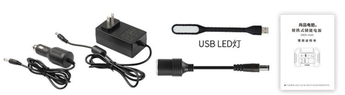 The portable power station comes complete with an AC adapter with power cable, 12 V car charging cable, 12 V car port socket converter, USB LED car light and user manual.