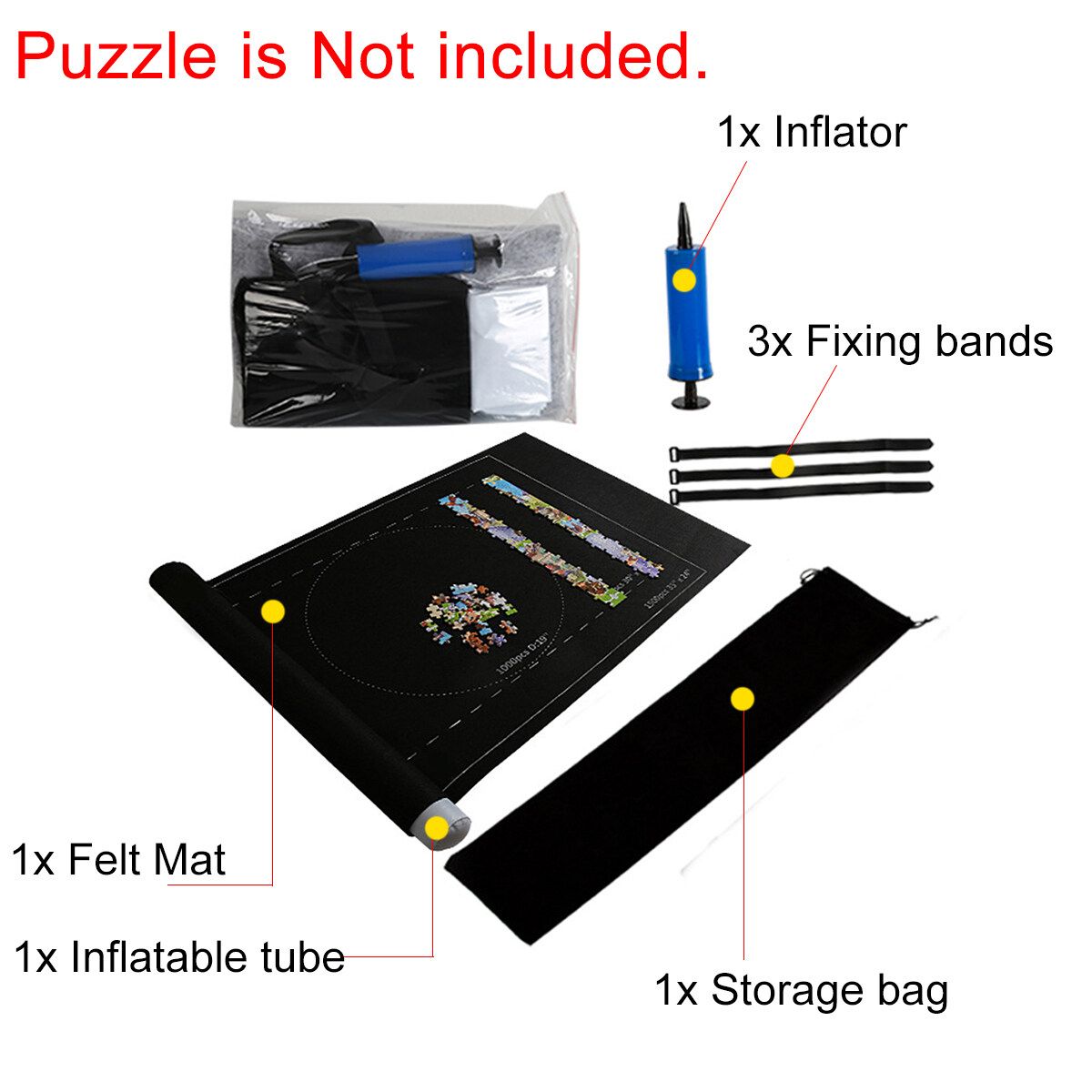 1x Felt Mat 1x Storage bag 1x Inflator 3x Fixing bands 1x Inflatable tube (Puzzle is not included.)