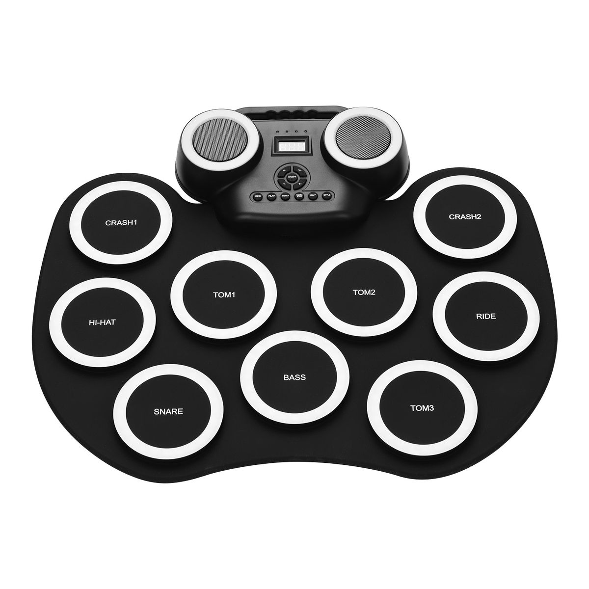 Professional Digital Drum Pads: The drum features 1 SNARE, 3 TOMS, 1 CRASH, 1 RIDE, 1 HI-HAT, 2 CRASHES; 2 foot pedals play sound of bass drum; 10 demo songs; 7 tones and 7 rhythms; LED Display.