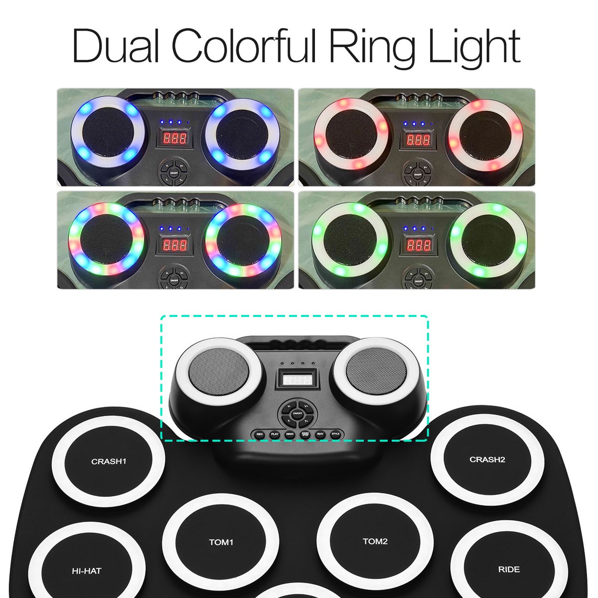 Colorful Light: Along with dynamic drum playing, the dual ring lights around the speakers have red, green and blue 3 colors to show. The 3 colors can cycle in order when the drum is on and no playing.