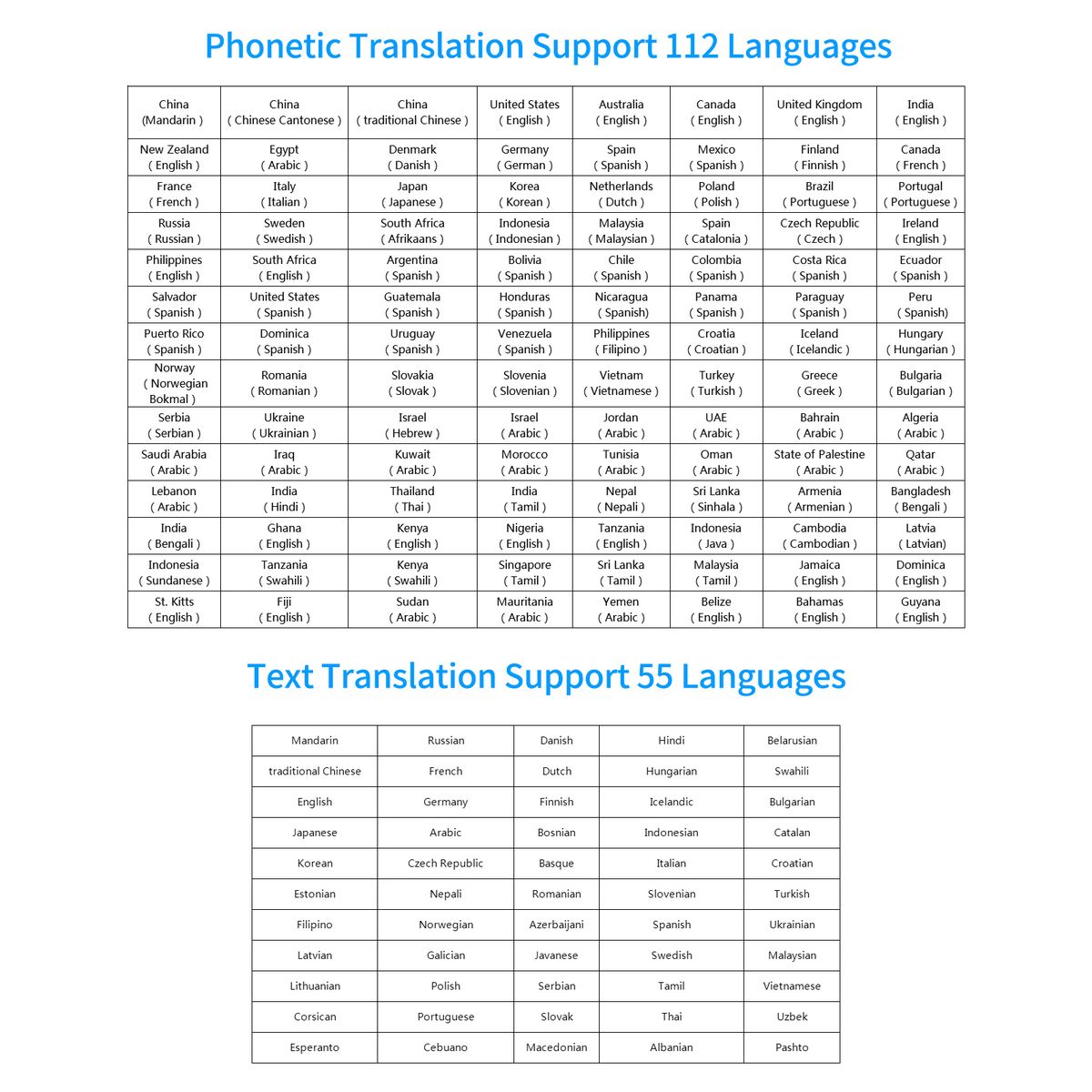 Phonetic Translation: Support 112 languages including English, French, German, Spanish, Italian, Portuguese, Swedish, Danish, Finnish, Norwegian, Dutch, etc.