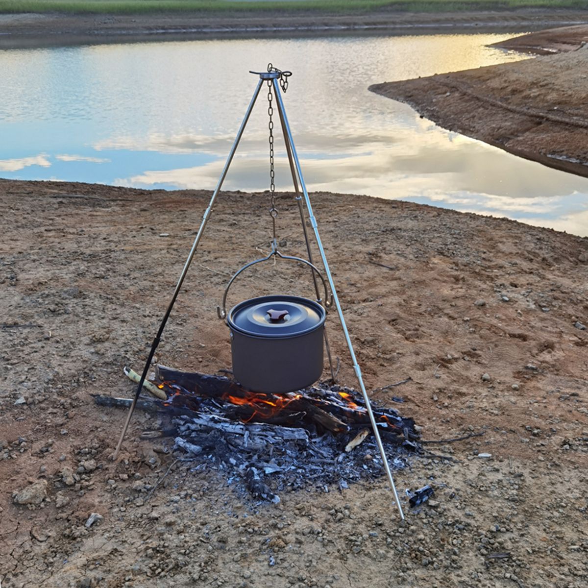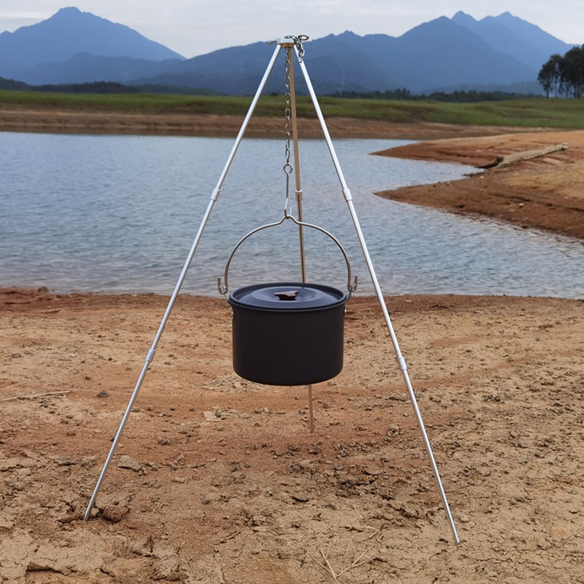 The tripod can be used with hanging pot and the height of the hanging pot can be adjusted by the chain. Foldable portable design, it is suitable for family camping and picnic.