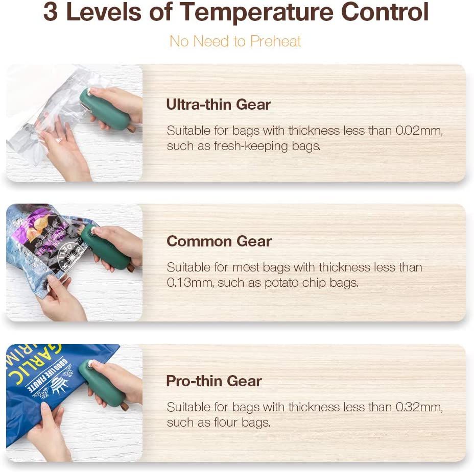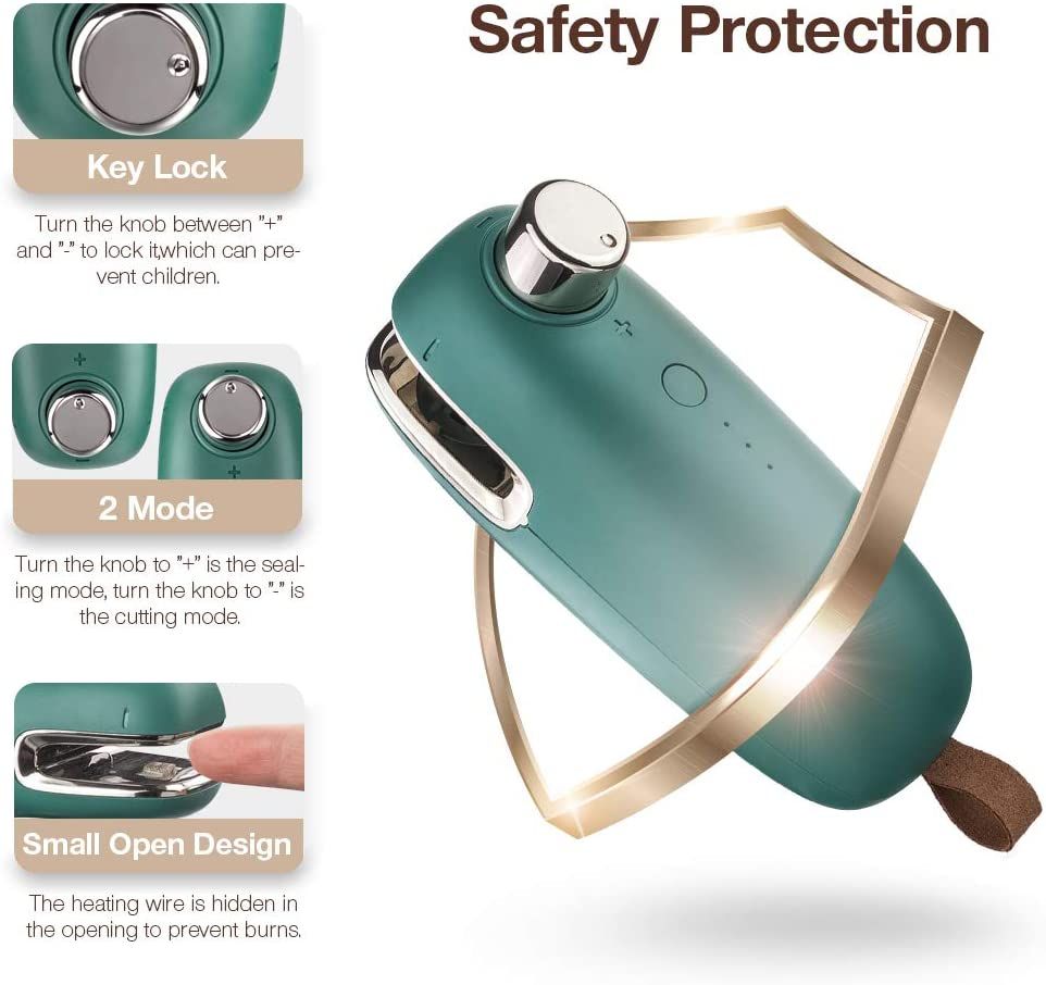 [Three Sealing Modes, Sealing All Types of Bags] -- The 2-in-1 mini heating sealer uses a high-tech circuit board to adjust the temperature, and there are 3 modes to choose from (for thick bags, ordinary bags and ultra-thin bags mode). Perfect for storing your leftover snacks, food, fruits, etc. to avoid waste and mildew growth and keep food fresh. [Safe Design, Easy to Use] -- The potato package sealer has a built-in high-tech circuit board, high-quality heat insulation effect, patented triple anti-scalding and double high-tech protection to make it safe and reliable. Turn the knob to the "+" position to seal the bag, then turn to the "-" point to open the bag. When not in use, turn the knob to the middle area of "+" and "-" to lock it and prevent acci heating, to prevent children from being harmed. [USB Charging, Long Working Time]-- The traditional battery-powered heat sealer requires frequent battery replacement. This USB rechargeable pack sealer uses a large-capacity (1500mAh) rechargeable lithium battery. It can be used for about six months after being fully charged. This greatly helps you save time, money and labor. Equipped with a 30 cm long USB data cable, compatible with your mobile phone, computer, , car charger, etc., you can charge the bag sealer anytime, anywhere [Small and Portable] -- This mini bag sealed bag is small and portable. With hanging ss and netic strip on the back, you can hang it on the wall, behind a door or paste it into the refrigerator to save space. You can also put it in your backpack for camping, hiking, fishing, or vacation, and use it to reposition those remaining snack bags or fruit bags when you leave. [Wide Application] -- The famous package sealer can seal multiple general-purpose packaging bags: coated aluminum bags, PP, PE, PVC with a thickne of 0.3 mm or le. General plastic bags,rice, tea, s, flavor, salt bags, traditional Chinese medicine. Can fully meet your daily use requirements. Specifications: Color: Green,Pink, Material: Plastic Size: 12.2*4.8cm Package Contents: 1 * Bag Sealer 1 * USB Data Cable Only the above package content, other products are not included. Note: Light shooting and different displays may cause the color of the item in the picture a little different from the real thing. The measurement allowed error is +/- 1-3cm.