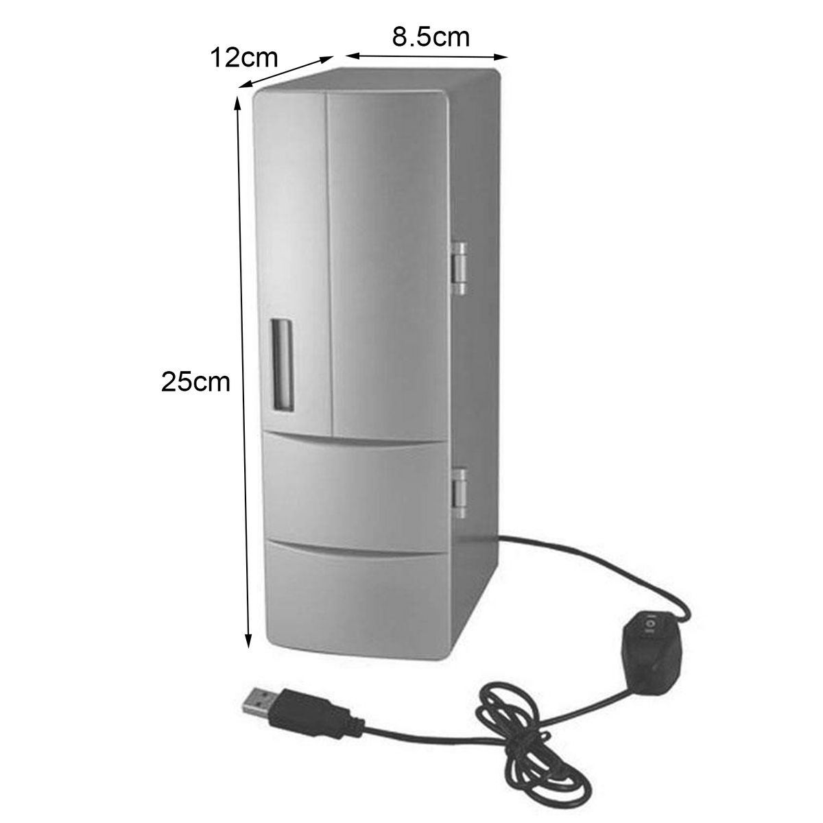 This mini fridge has 25cm height, 12cm length and 8.5cm width in outside dimensions. And the cable length is 1m.