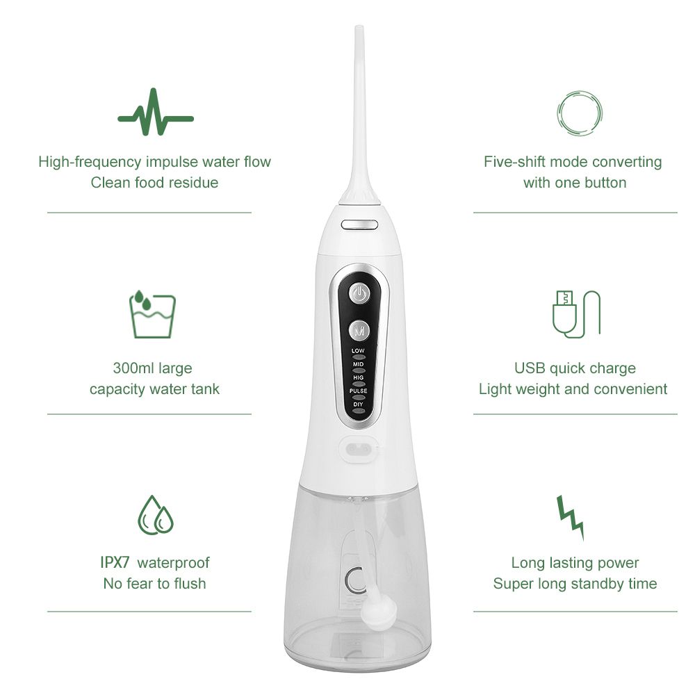 Features:[Portable Electric Oral Irrigator] -- Portable water flosser with 1400-1800 times/ min high pressure water flow is easy and efficient to use, suitable for home, business trip and travel. It can provide you with deep cleaning of tooth blind area to protect gum health. And it supports IPX7 waterproof level for convenient use (make sure the water tank is closed tightly).