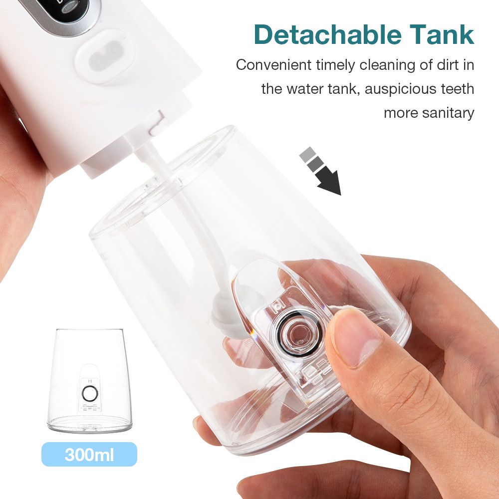[Complete Kit for Teeth Care] -- The set includes a portable oral irrigator, 6 jet tips (standard, orthodontic, periodontal, tongue scraping) with individual package, an USB cable and an English user manual. The main body and the water tank can be easily separated to refill the water tank or to carry the disassembled oral irrigator conveniently.