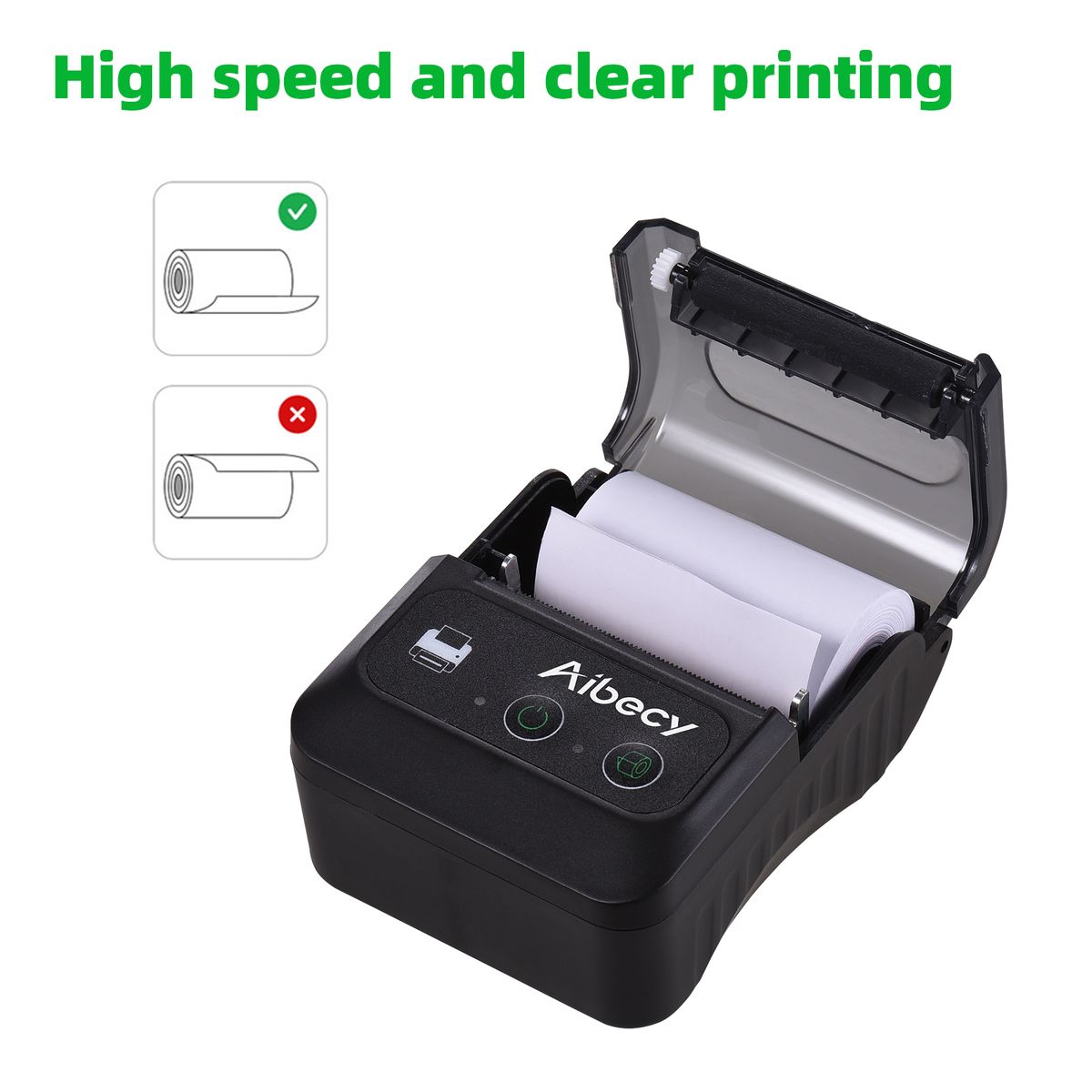 Features:Mini BT thermal receipt printer, 58mm paper width, 48mm print width, 50-80mm/s print speed, 203dpi resolution.