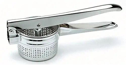 Easily create fluffy and lump-free mashed potatoes and fruits with this round potato ricer. Designed with perforated sides, this ricer produces perfectly pressed potatoes and other root vegetables with minimal effort.Thanks to its stainless steel construction, this potato ricer is easy to clean. For added convenience, this potato ricer provides a comfortable grip. Simply rest the Potato Ricer on a pot or bowl and squeeze the soft handles together for perfectly mashed potatoes. Strong stainless steel makes this Ricer sturdy. Make your own baby food by ricing fruits or vegetables.Excellent for mashing any boiled or steamed potatoes and vegetables into perfect mash