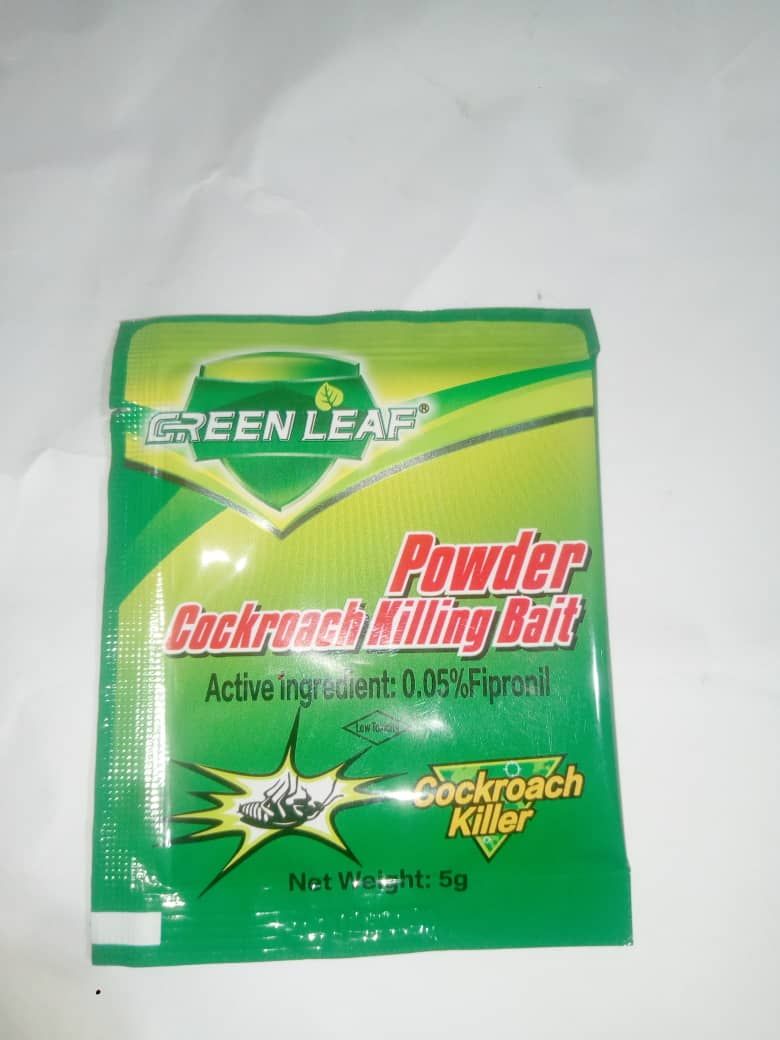 drawers, wardrobes or hallways 2. Each bag is better used for 3 to 5 spots. In order to ensure the effectiveness, once opened, it should be used up at one time. 3. It is suggested to replace the powder every seven days. Cockroaches will be eradicated after you use the powder for two to four times in succession 4. The more the powder cockroach killing bait is placed, the better the effect will be. If a place is heavily-infested by cockroaches, please apply the powder to the whole area.Description Effectiveness 1. Strongly effective in killing cockroach and its eggs: green leaf powder cockroach killing bait can kill a large amount of cockroaches directly. It also can impede the eggs from hatching, which leads to their abnormal death and thus achieves a unique effect of cockroach eradication 2. Sanitary and environment-friendly: no chemical residues, non-polluting, no irritant odor Directions for use 1. Open the small plastic bag and pour the powder bait where cockroaches are frequently observed or tend to hide. It can be poured in dark places, around inlets of sewer, by cupboards or refrigerators, under sinks, near kitchen ranges and in drawers, wardrobes or hallways 2. Each bag is better used for 3 to 5 spots. In order to ensure the effectiveness, once opened, it should be used up at one time. 3. It is suggested to replace the powder every seven days. Cockroaches will be eradicated after you use the powder for two to four times in succession 4. The more the powder cockroach killing bait is placed, the better the effect will be. If a place is heavily-infested by cockroaches, please apply the powder to the whole area.