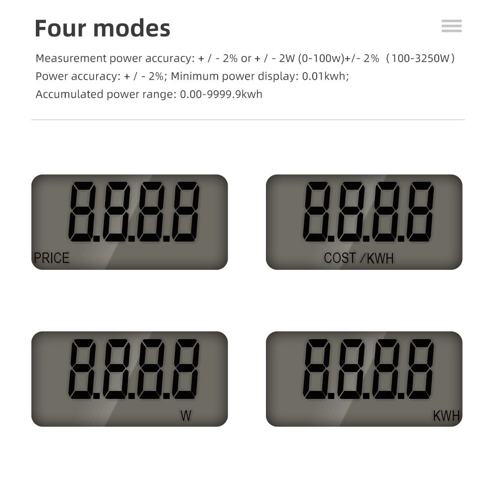 Measuring Energy Range:230V - 250V for EU / UK / AU plug, 110V - 130V for US plug