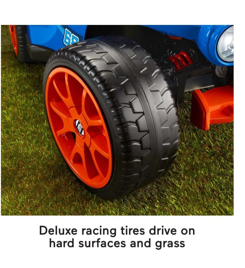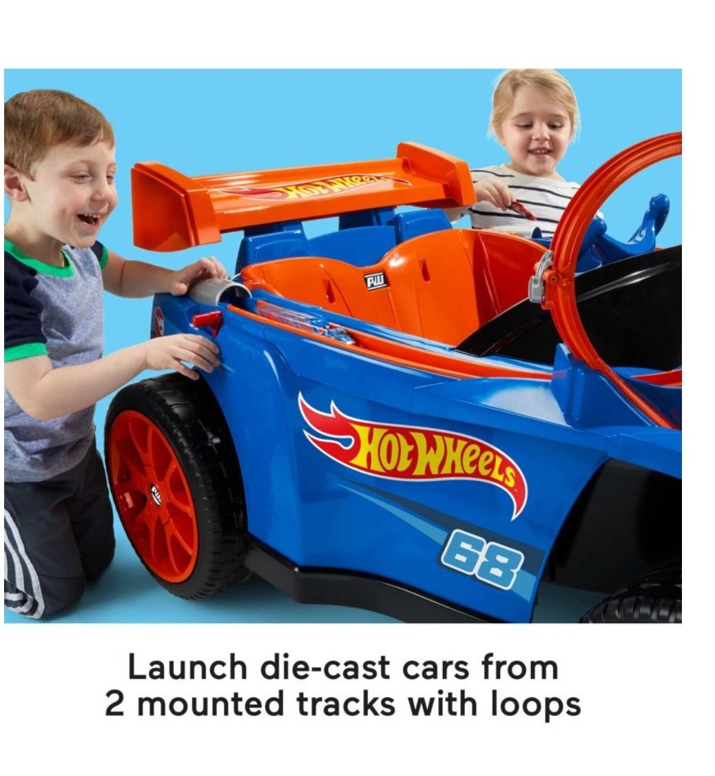 Young racers can live out their ultimate racing dreams with this Power Wheels Hot Wheels Racer ride-on vehicle from Fisher-Price. This epic ride-on combines the driving excellence of a Power Wheels vehicle, including 12-volt battery power, high-speed lock out and Power-Lock brakes, with Hot Wheels styling, graphics, and track play for a super-cool experience. Kids can launch and race their die-cast cars on the vehicle's mounted track, then hop in the driver's seat to create their own life-size racing adventures.