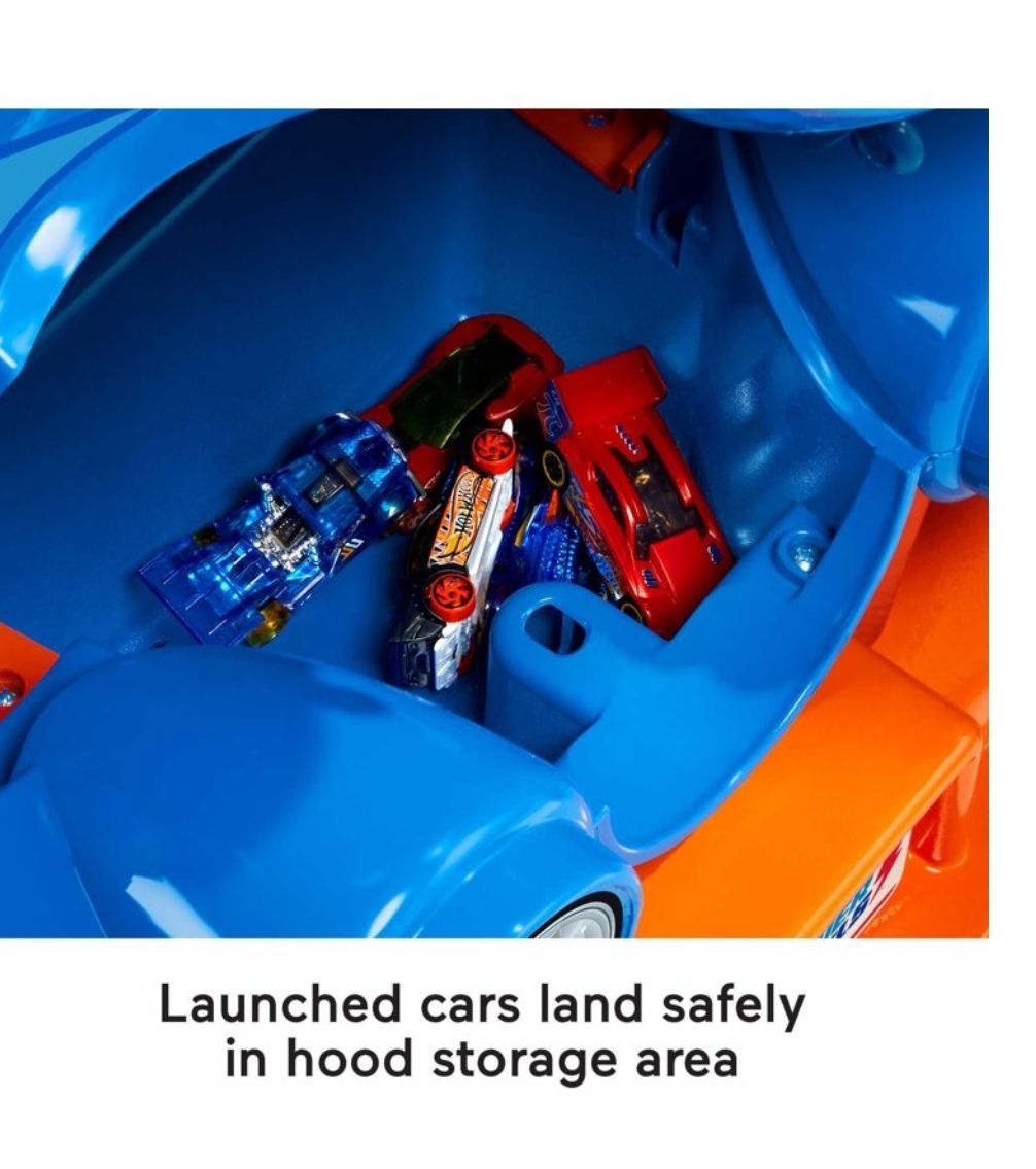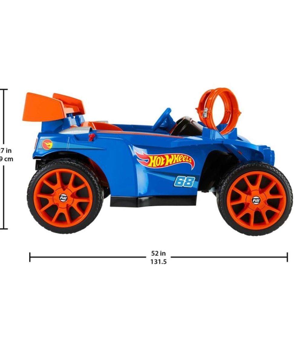 Age Range: 3 to 7 YearsBattery-powered ride-on vehicle with Hot Wheels colors & graphics plus 2 orange tracks and launchers for racing playComes with 5 Hot Wheels die-cast cars to launch from the mounted tracks into the storage compartmentVehicle drives on hard surfaces and grass at a max speed of 5 mph (8 km/h) forward, 2.5 mph (4 km/h) in reversePower-Lock brakes and parent-controlled, high-speed lock out for beginner driversFor young racers ages 3-7 years; Seats 2, max weight 130 lb