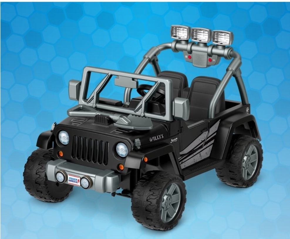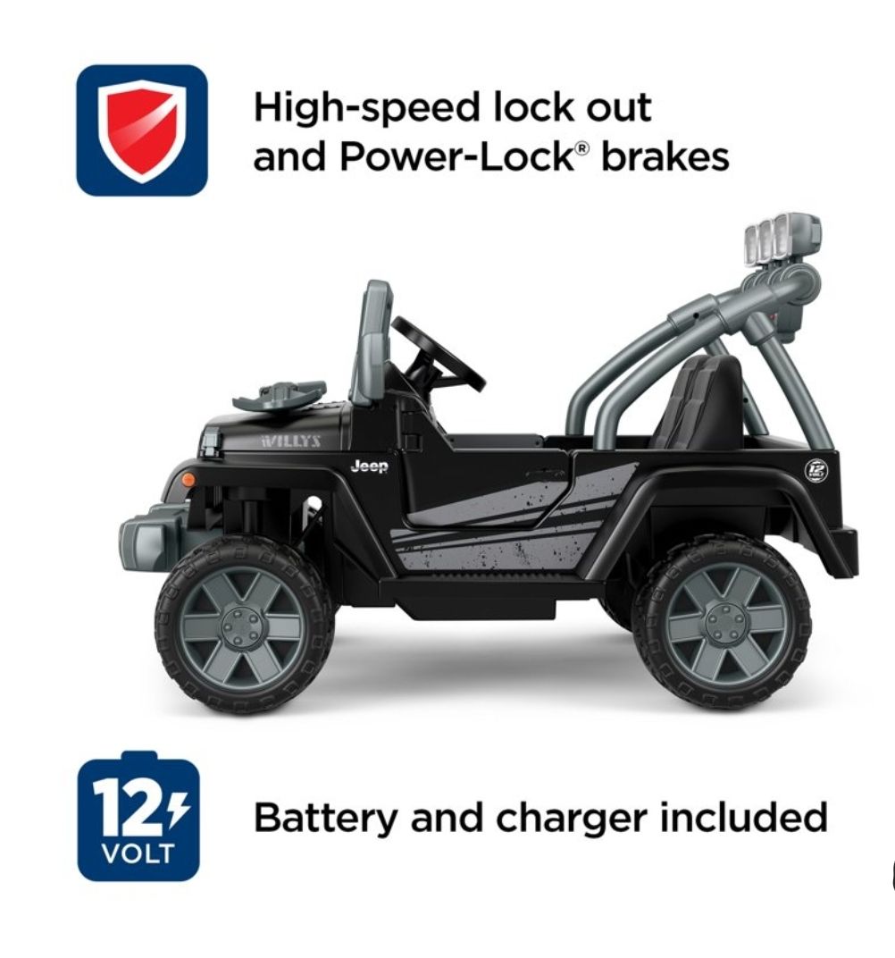 Kids can embark on awesome off-road adventures with the Power Wheels Jeep Wrangler Willys ride-on which features realistic Jeep vehicle styling a real working light bar pretend fog lights and doors that open and close. Little drivers will feel like theyre riding in the real thing! For cool role play fun the vehicle comes with a removable toy shovel as well as a dashboard with a pretend radio that plays driving sounds and a microphone with a voice changer. Your young driver will love zooming over hard surfaces and grass at a max speed of 5 mph 8 km-h and youll love the parent controlled high speed lockout and Power Lock brakes.
