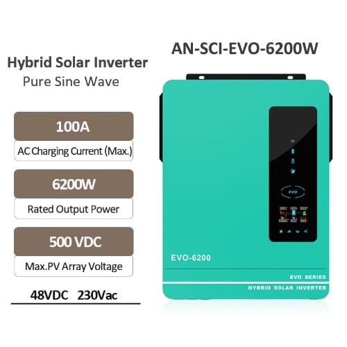 This Anern 6.2kva is a Solar Hybrid Inverter with 120A inbuilt MPPT Charge Controller. It's a pure sine wave inverter with Power Factor of 1.0. It has a Max Solar input power of 6,500W. This inverter has a built in anti dust kit for harsh environments. It has a smart battery charge deaign to maximize battery lifespan. Anern 6.2kva inverter is compatible with lithium battery.