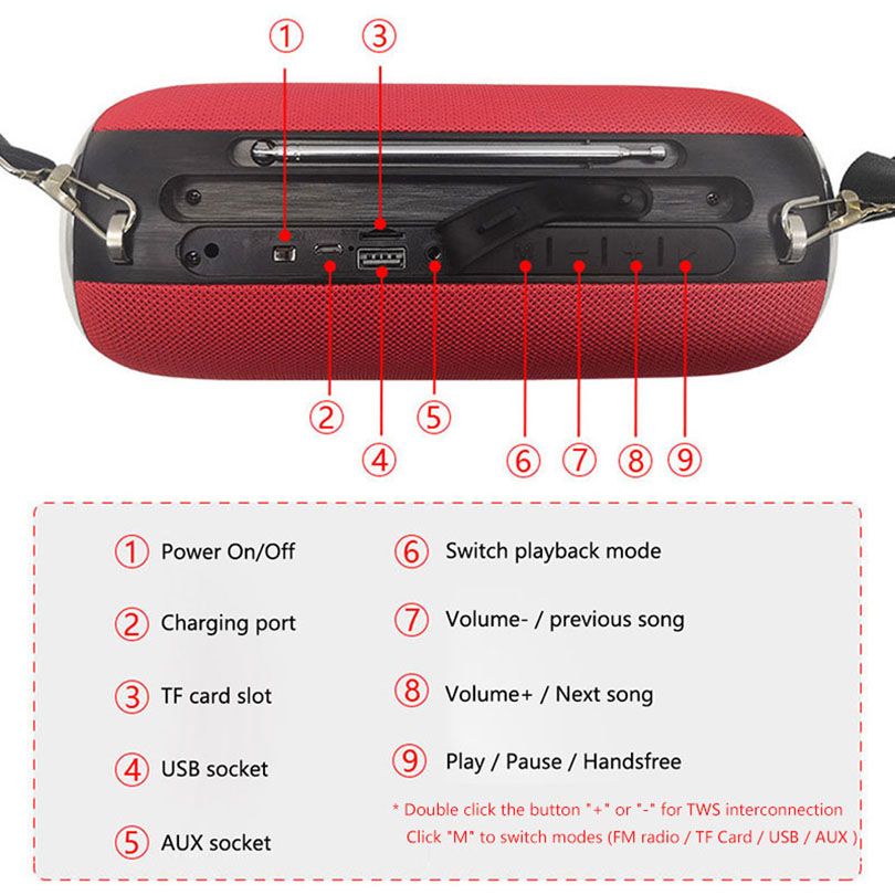 1. and high quality; 2. Wirele 5.0, fast connection and stable signal, compatible with all Bluetooth devices; 3. Double high-power speakers, stereo sound; 4. Support TF card/USB/AUX wired playback; 5. Add an external radio to enhance the reception of FM radio signals; 6. Supports hands-free call for incoming calls; 7. Top mobile phone support function; 8. Support interconnection function, two speakers are interconnected at the same time to form a real stereo sound system (double-click the on "+" or "-" ar booting). Specification: Wirele version: 5.0 Wirele distance: 10 meters Battery capacity: 1200mAh Charging time: 2-3 hours Work time: 5-8 hours Product size: 230*95*95mm Packing list: Wirele speaker* 1 Charging cable* 1 Packing Box*