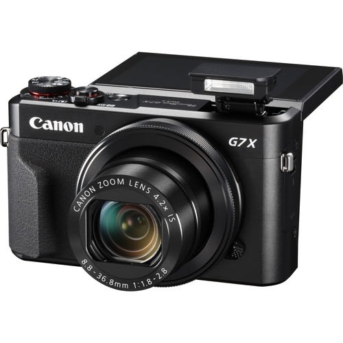 Blending notable imaging qualities with refined handling, the PowerShot G7 X Mark II Digital Camera from Canon is a compact point-and-shoot characterized by its large feature-set. Utilizing a 20.1MP 1" CMOS sensor and DIGIC 7 image processor, this camera offers a maximum ISO 12800 in Program mode, and achieves smooth image quality with reduced noise when working in low-light conditions. Additionally, it is also capable of recording stills at up to 8 fps as well as Full HD 1080p60 video. Complementing the sensor and processor combination is a versatile 4.2x zoom lens, which provides a 24-100mm equivalent focal length range, covering wide-angle to short-telephoto perspectives. A fast f/1.8-f/2.8 maximum aperture maintains consistent performance throughout the zoom range and also benefits working in difficult lighting conditions. The lens design is surrounded by a familiar control ring that offers intuitive control over settings, and a large 3.0" 1.04m-dot tilting touchscreen LCD provides a natural means for composing imagery from a variety of shooting angles. Additionally, the G7 X Mark II also features built-in Wi-Fi with NFC for wireless