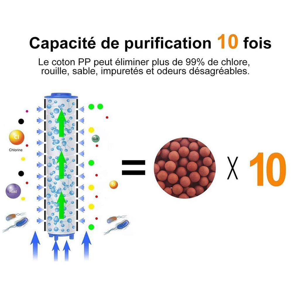 3-layer filter: shower head filter with improved filter system, high-quality filter materials, PP cotton filter, anti-limescale negative ions mineral balls and cotton pad form a triple filter system that can effectively filter out chlorine, sand, rust, bacteria and other impurities in the water, soften hard water and maintain the pH value of the water.