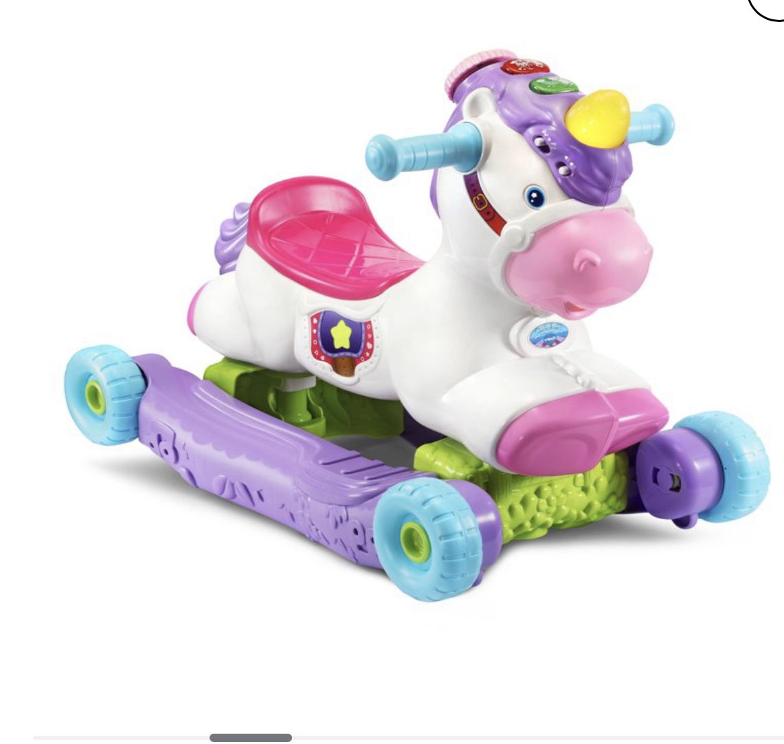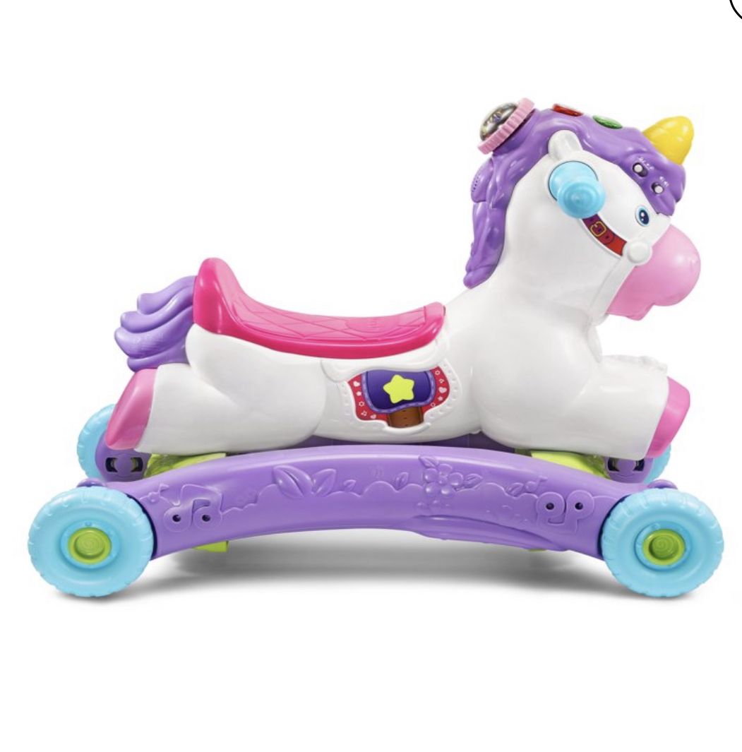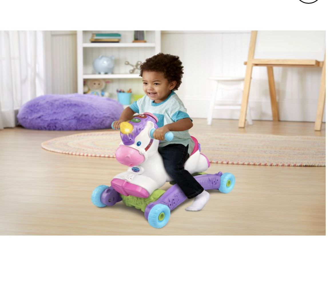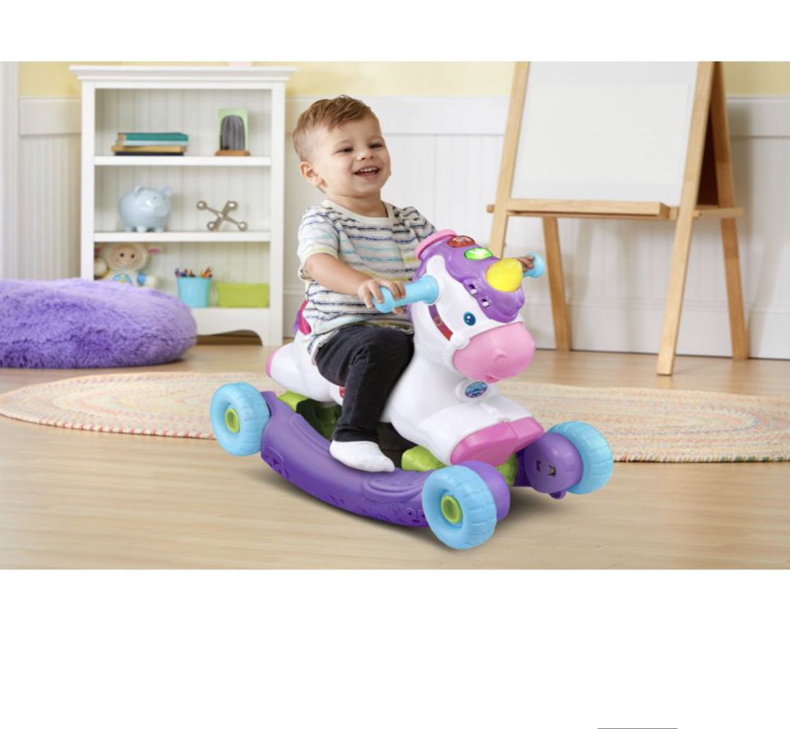 Go on a magical ride on a prance and Rock Learning unicorn!This grow -with me unicorn transforms a rocker to a ride on in seconds. As toddlers Rock and ride. The built in sensors respond with playful music and magical unicorn sounds to encourage gross-motor development and imagination.Intended for ages 12-36 months.Requires 2 AAA batteries.Battery included for dem purposes only. New battery recommended for regular use