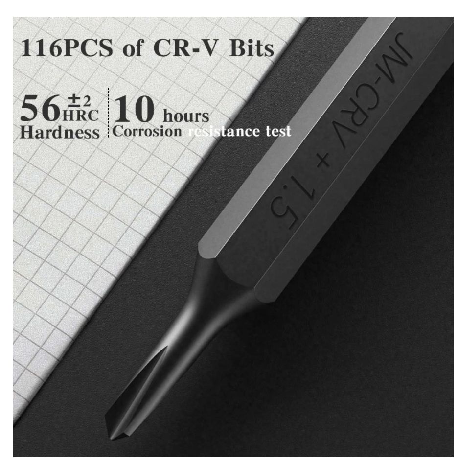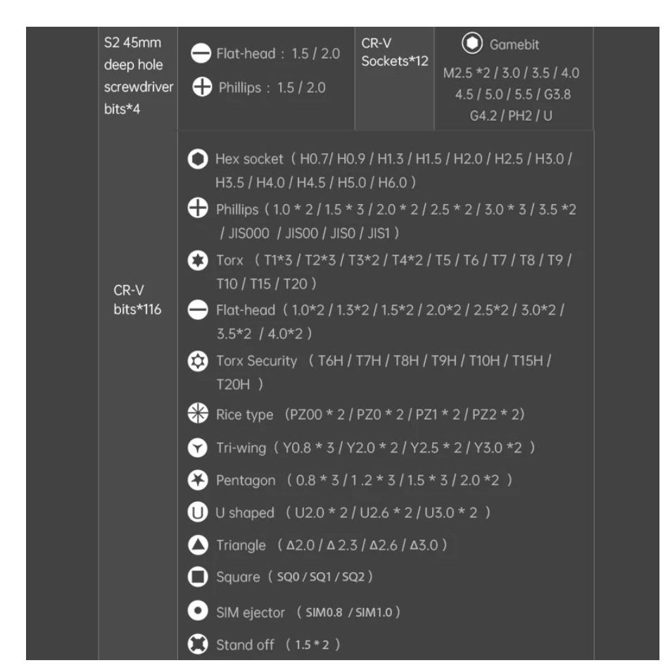 CR-V Bits:Hex Socket:H0.7/H0.9/H1.3/H1.5/H2.0/H2.5/H3.0/H3.5/H4.0/H4.5/H5.0/H6.0Phillips:1.0*2/1.5*3/2.0*2/2.5*2/3.0*3/3.5*2/JIS000/JIS00/JIS0/JIS1Torx:T1*3/T2*3/T3*2/T4*2/T5/T6/T7/T8/T9/T10/T15/T20Flat-head:1.0*2/1.3*2/1.5*2/2.0*2/2.5*2/3.0*2/3.5*2/4.0*2Torx Security:T6H/T7H/T8H/T9H/T10H/T15H/T20HRice type:PZ00*2/PZ0*2/PZ1*2/PZ2*2Tri-wing:Y0.8*3/Y2.0*2/Y2.5*2/Y3.0*2Pentagon:0.8*3/1.2*3/1.5*3/2.0*2U-shaped:U2.0*2/U2.6*2/U3.0*2Triangle:Δ2.0/Δ2.3/Δ2.6/Δ3.0Square:SQ0/SQ1/SQ2SIM ejector:SIM0.8/SiM1.0Standoff:1.5*2