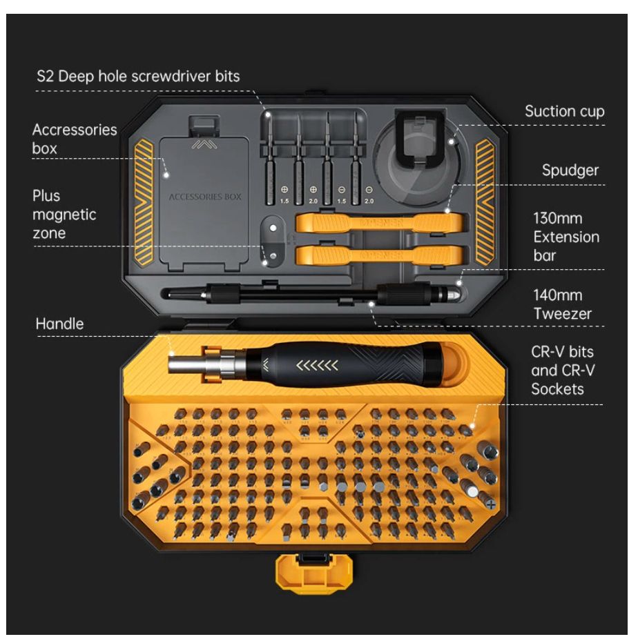 Feature:--Model:JM-8183 145 in 1 Screwdriver Set--Bits Material : CR-V Material --Feature : Magnetic,Non-slip,Precision,Screwdriver Rotating cap design--Application : Smartphone /Tablet/Display/Camera/Laptop/Computer