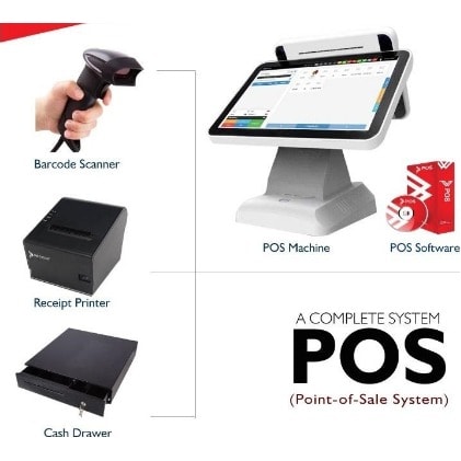 Pos software + Hp Monitor + Hp Desktop + Cash Drawer + Scannner + 58mm Printer