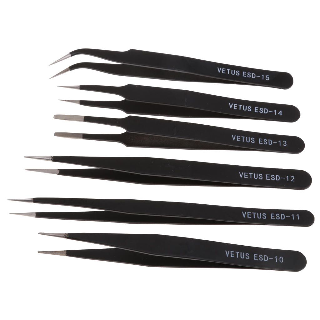 6Pcs Stainless Steel Tweezers Set Anti-Static Forceps Kit Repair Tool