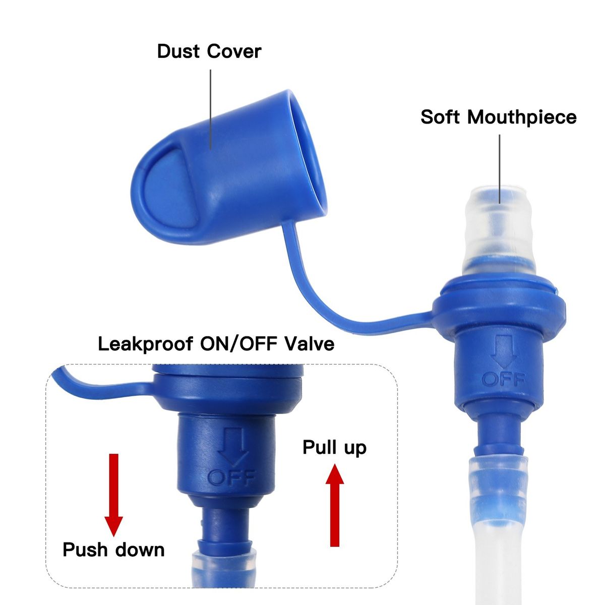 Soft mouthpiece with ON/OFF valve and dust cap.