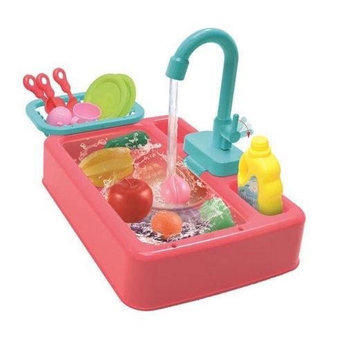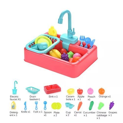 Kids Kitchen mini sink 16 pcs Kitchen Dishwash red fruit dish pretend play set. Pretend Kitchen sink pay set with 16 pcs includes Pretend sink 1 and others pieces.Made of high quality ABS plastic smooth edges without burrs odd free non-toxic child friendly.Kids are able to learn about using kitchen sink and washing dishes and various other kitchen activities.