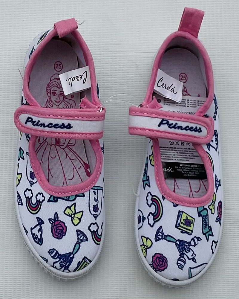 Princess print sandal for baby girls by Cerda. Made in soft canvas, the uppers have a rainbow print finish. Lined in soft leather, they have a rubber sole and fasten with a velcro strap.