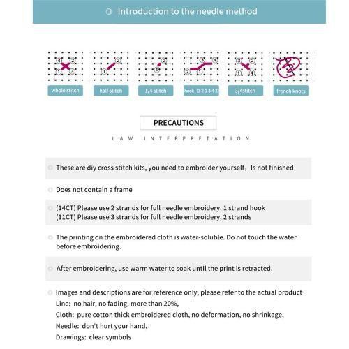 [Notes](11CT)Please use 3 strands for full stitch.2 strands threads for back stitch. After finishing. put the pattern in warm water for 20 minutes.then make it dry.and then you can make a frame for it as you like. Important: please do not get the pre-stamped pattern wet before you finish it because it is washable. Color blocks on the printed pattern are not the real color of the floss. Please be sure to use the colored tread according to the symbols.