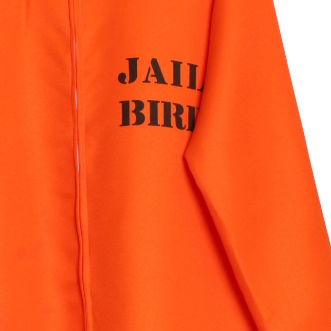 - The adult jumpsuit has black writing on the chest stating "JAILBIRD".