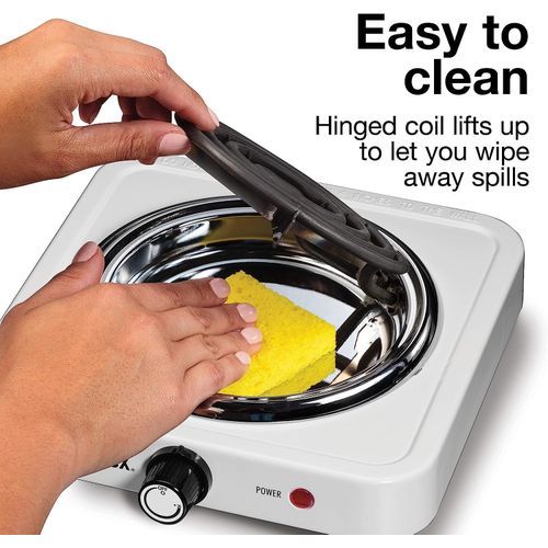 - EASY-TO-CLEAN PLATE AND HINGED 5 5 INCH DIAMETER COIL For easy cleaning lift up the heating coil after it cools completely to access the plate beneath then simply wipe away any spills or messy drips