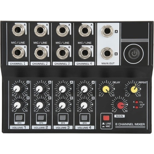 - Each channel has GAIN, 3-band EQ, AUX, EFFECT, PAN control knobs and volume control faders.