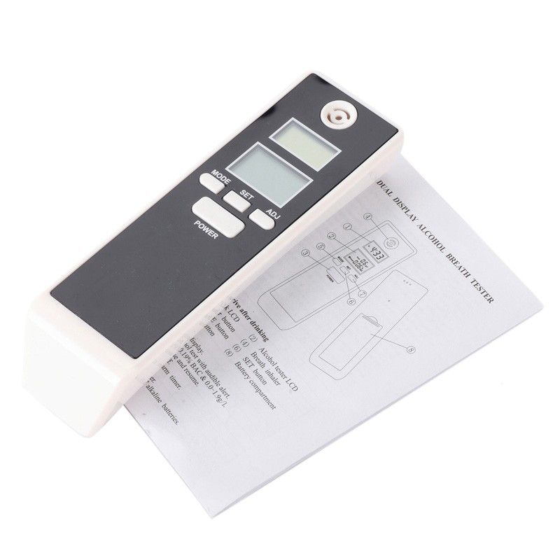 Function: 1. Dual LCD display 2. Digital display results (% BAC / g/l) 3. Red Backlight 4. Alert level calibrated 5. Quick response and resume 6. Auto power off 7. Real time & alarm time 8. Countdown & count-up timer keep the deadline of your parking Specifications: 1. r: advanced semiconductor oxide alcohol r 2. Detect range: 0.00-0.19% BAC / 0.0-1.9 g/l 3. Warm-up time: within 10 seconds 4. Respond time: within 5 seconds 5. Operating temperature range: 10~40 6. Envmental temperature: 40%-90% 7. Power input: use 2x "AAA" alkaline batteries (not included)