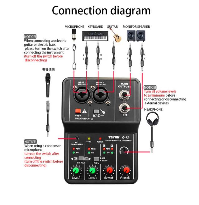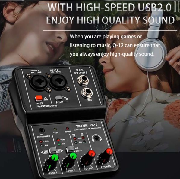 Feature: 6 major functions worth having. The new generation Q-12 has updated technology and compatibility: mic preamp/line input/instrument input, 1GBIT/48KHZ, monitor function, computer USB power supply/digital audio connection port, main output port, individual volume control adjustment for each channel With high-speed USB2.0. Enjoy high-quality sound quality, the Q-12 ensures you always enjoy high-quality sound when you play games or listen to music The ideal sound card for singer-songwriters. The new Q-12 provides users with a simpler and more convenient recording process, and is equipped with a high-precision 16-BIT/48KHZ audio resolution to ensure that the sound quality is as professional as ever. 48V phantom power supply. Provide switchable 48V phantom power supply, escort power consumption Connect the computer and supply power at the same time. USB is used to connect to a computer and supply power at the same time. It can also be connected to for iPad to use mobile karaoke or make music on the go. Stable and compatible with mainstream audio software. Realize second connection, fast transmission rate, low power consumption, more stable signal Applicable to a variety of scenarios. Don't let the device limit your imagination, music recording, home karaoke, network karaoke, etc. Specification: Item: computer recording sound card Color: black Input channel: 2 mono (MIC/LINE), can be switched to 1 stereo Output channel: 1 stereo Phantom Power Voltage: +48V High Pass Filter: Attenuates frequencies below 80Hz with a 12dB octave slope USB audio: sampling rate 48KHZ; bit width 16bit Power requirements: ≥5W Size: 14*10*4.4cm/5.51*3.94*1.73'' Color box size: 15.2*12.5*5.5cm Gross weight: 0.285KG Note: Due to the different monitor and light effect, the actual color of the item might be slightly different from the color showed on the pictures. Thank you! Please allow 1-2cm measuring deviation due to manual measurement.