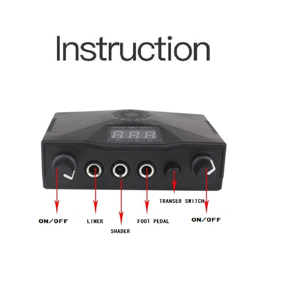 - 4. 1 x LCD Daul Digital tattoo power supply with (US/ES/AU/UK) power cord,1 Steel foot switch & 1 black clip cord.