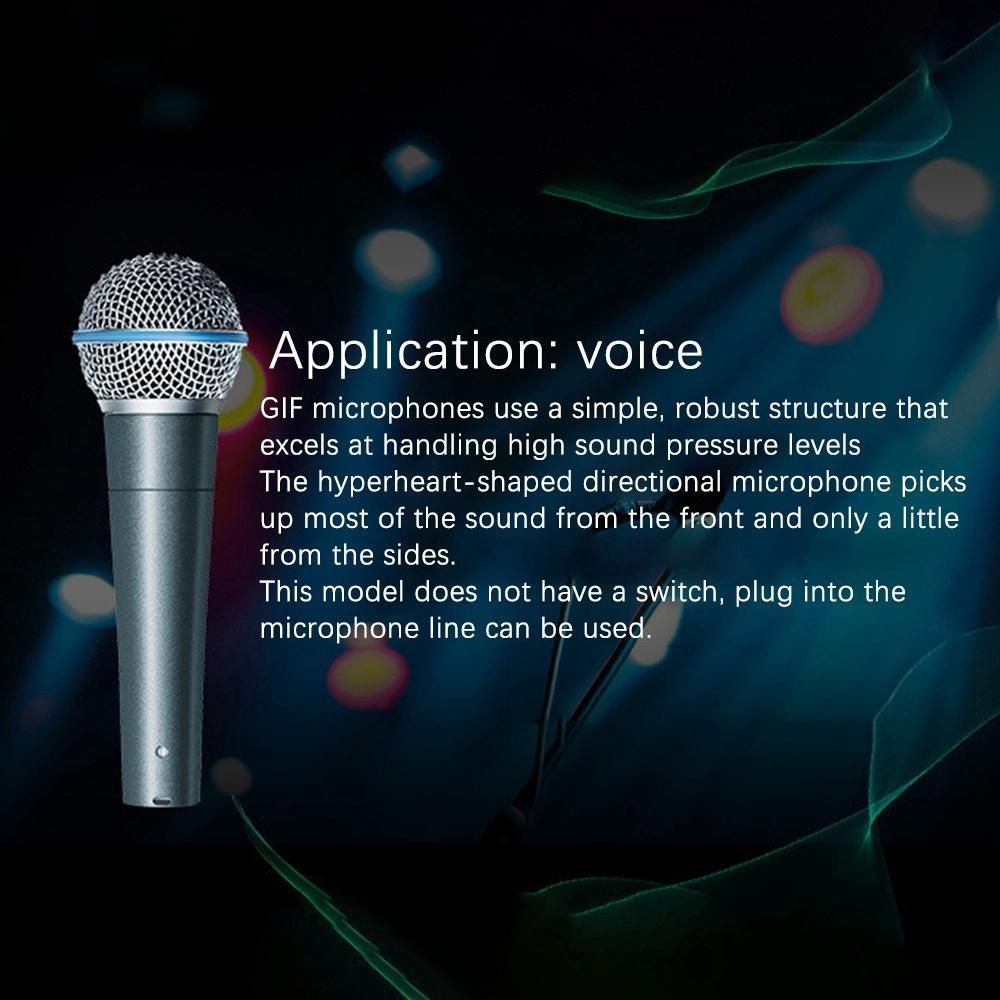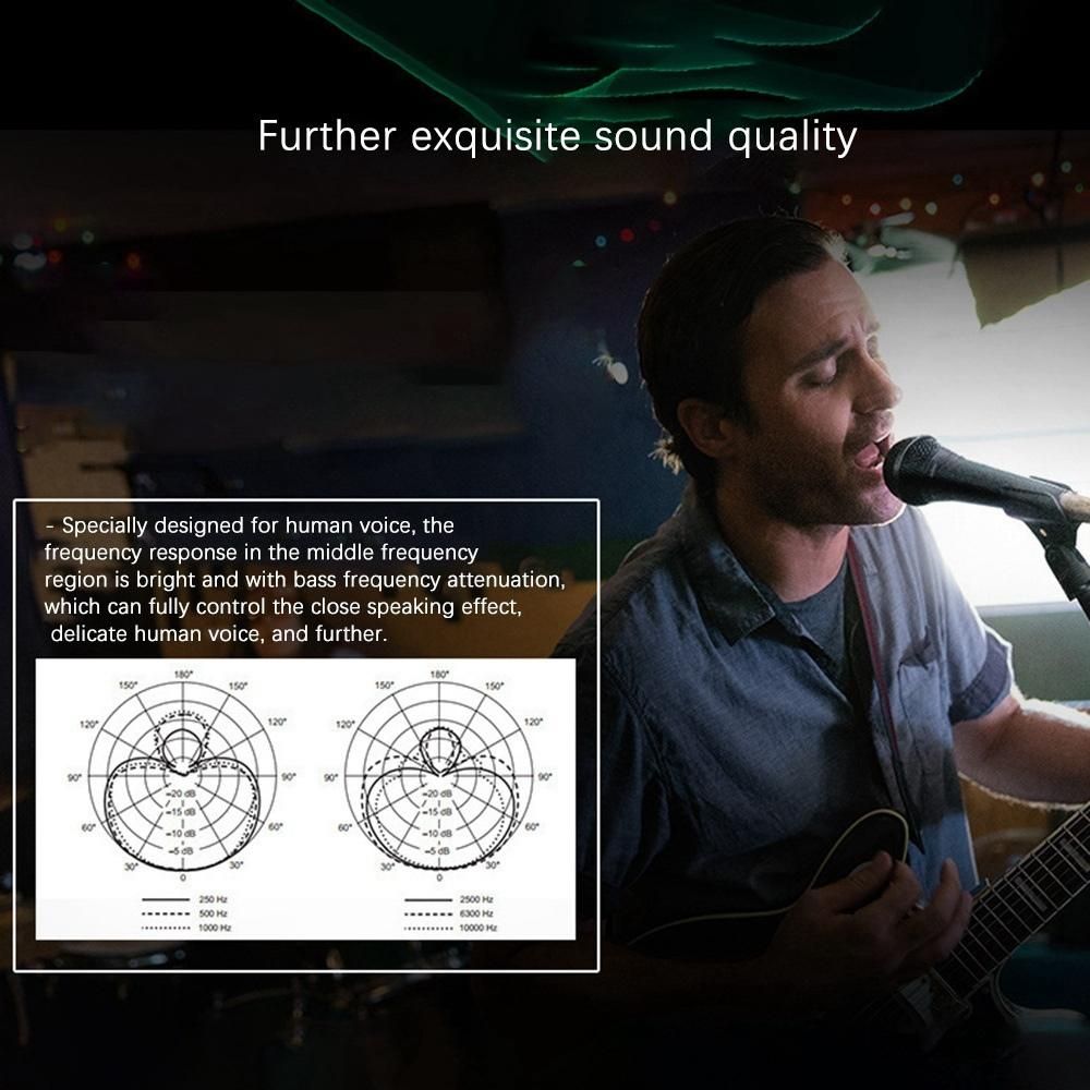 Detailed Information About The Product:dynamic vocal microphone is suitable for live performance and studio recording. The modified frequency response highlights the human voice, and the supercardioid mode can isolate other sound sources.
