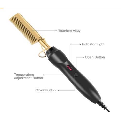 hot comb (also known as a straightening comb) is a metal comb that is used to straighten moderate or coarse hair and create a smoother hair texture. A hot comb is heated and used to straighten the hair from the roots. It can be heated by turning on the control button A hot comb (also known as a straightening comb) is a metal comb that is used to straighten moderate or coarse hair and create a smoother hair texture. A hot comb is heated and used to straighten the hair from the roots. It can be heated by turning on the control button A hot comb (also known as a straightening comb) is a metal comb that is used to straighten moderate or coarse hair and create a smoother hair texture. A hot comb is heated and used to straighten the hair from the roots. It can be heated by turning on the control button A hot comb (also known as a straightening comb) is a metal comb that is used to straighten moderate or coarse hair and create a smoother hair texture. A hot comb is heated and used to straighten the hairVoltage: 110-240V Volts (Universal Global Voltage) Frequency: 50/60Hz Power: 80W Fever: PTC Subject Material: ABS Thermal conductive material: tourmaline ceramics Heat conduction diameter: 16mm-20mm Temperature Control and Efficiency Adjustment: LCD, 120C-230C Line length: about 2 meters, 360 degrees rotating power cord Automatic shutdown for 60 minutes