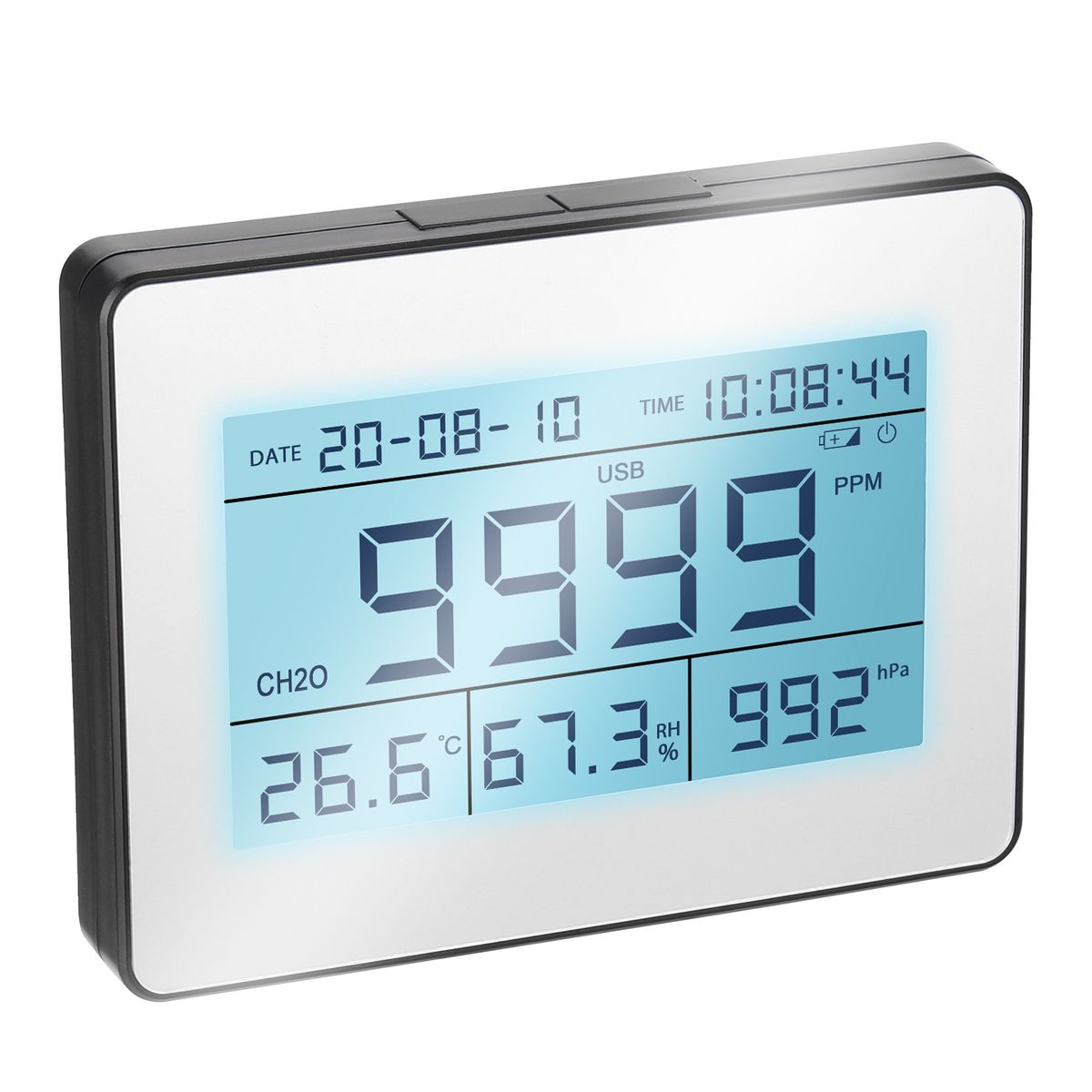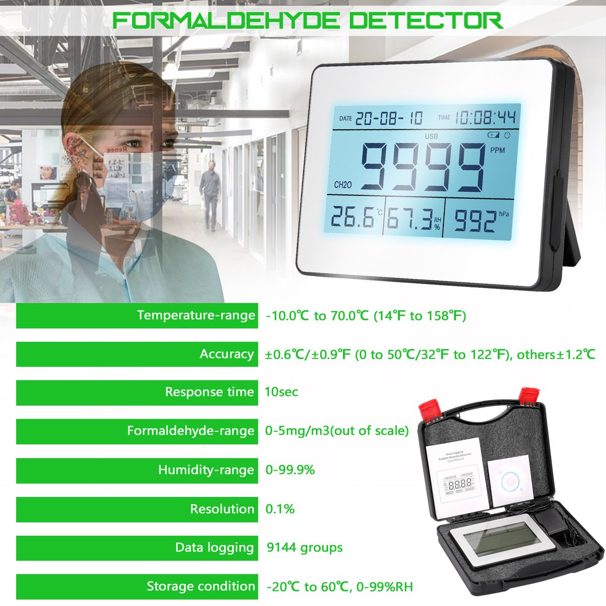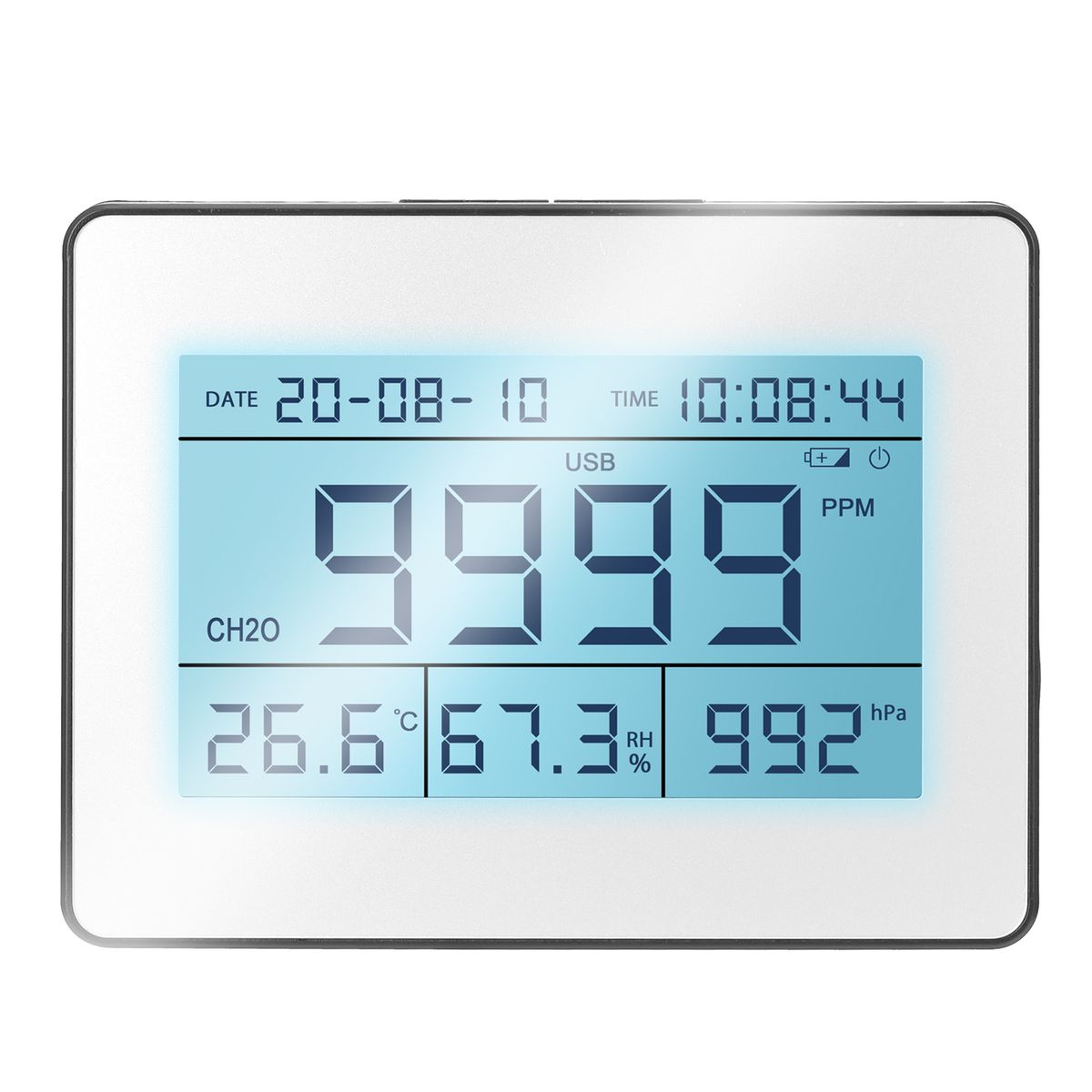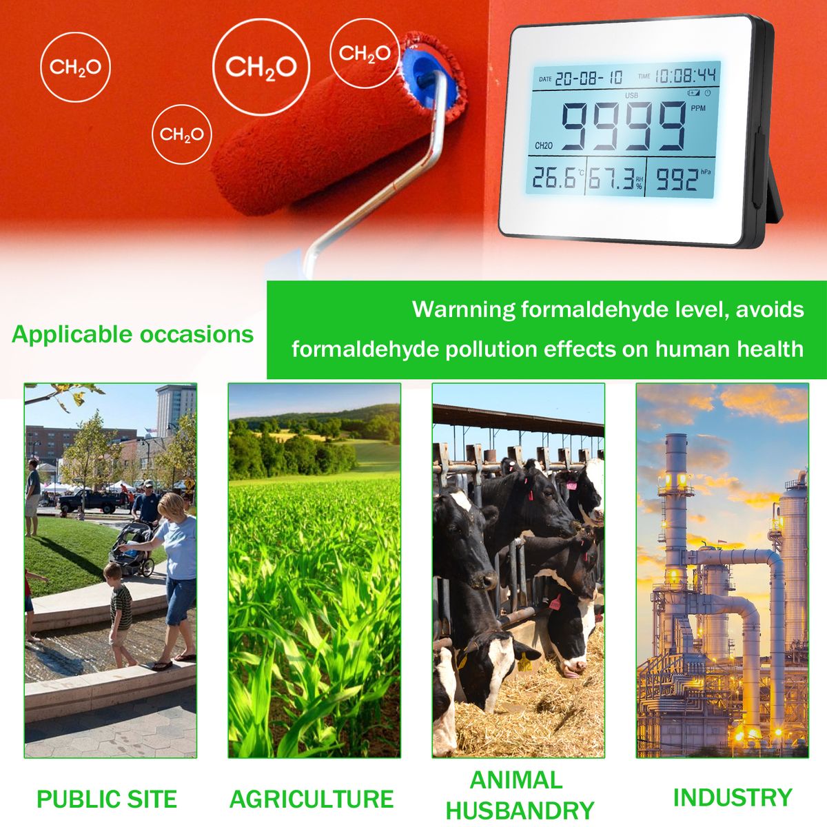 Warnning formaldehyde level, avoids formaldehyde pollution effects on human health.