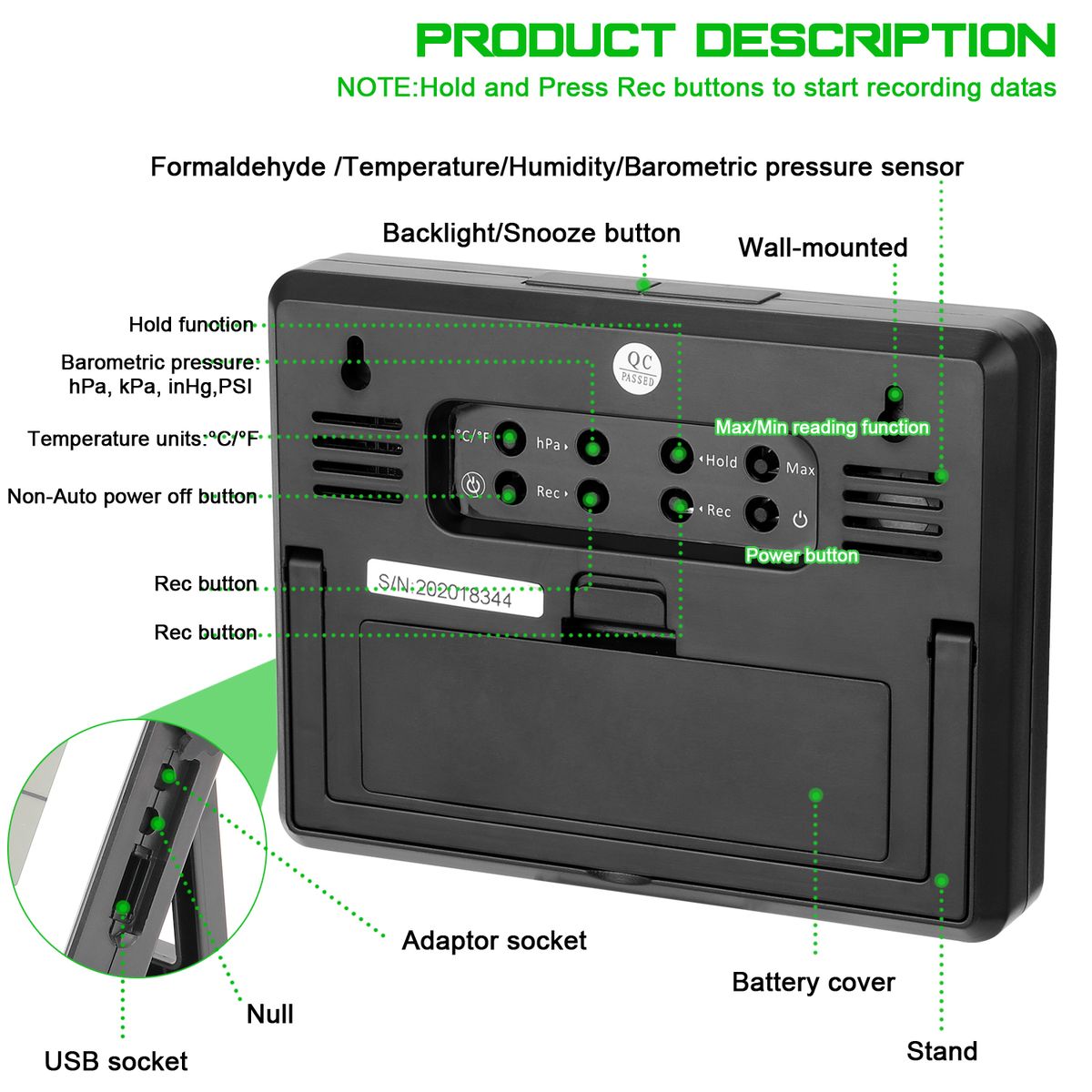 The perpetual calendar, min reading, USB connecting symbol, date recording symbol, time display, hold mode, max reading, low battery warning symbol, power off symbol(non-auto power off), date recording full capion, formaldehyde mreasuring reading, air temperature reading, humidity reading, barometric pressure reading will be displayed on LCD screen.