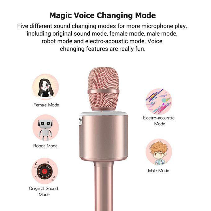 Five different sound changing modes for more microphone play, including sound mode, female mode, male mode, robot mode and electro-acoustic mode. Voice changing features are really fun.