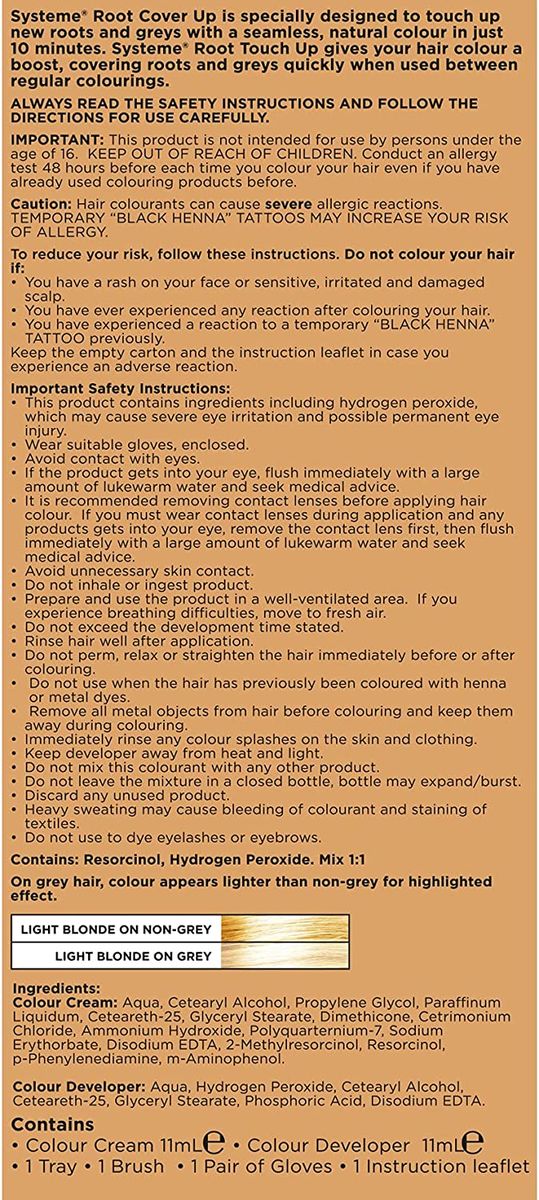 READY TO USE: Systeme Permanent Root Touch Up, includes mixing tray, gloves, application brush, colour cream, colour developer, step by step instructions10 MINUTE MAKEOVER!: Systeme Root Touch Up is specially designed to touch up new root growth and greys, natural colour in just 10 minutesQUICK HAIR BOOST: Systeme Root Touch Up give your hair colour a boost, covering roots and greys quickly when used between regular hair colouring sessionsABOUT THE PRODUCT: Systeme Permanent Root Touch Up, Light Blonde R010