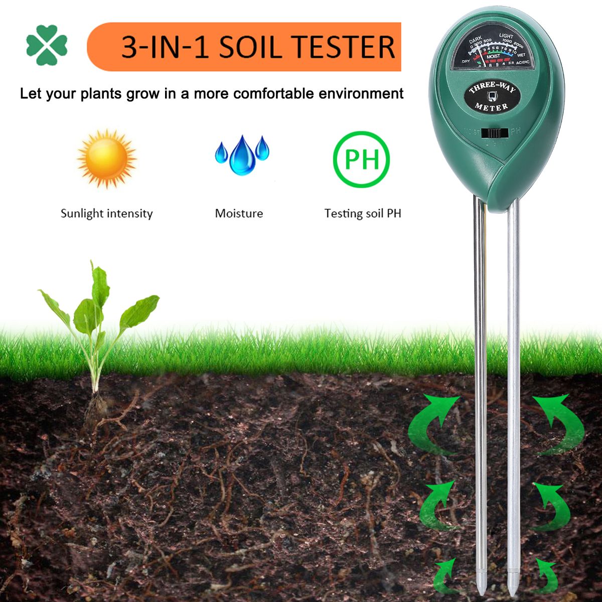 The soil meter can test the soil PH/moisture/sunlight intensity, and help you control the PH/moisture/sunlight intensity in the soil. (Note: this tester is only used to test soil.)
