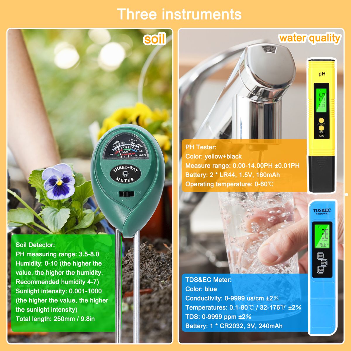 A set of three instruments is convenient for you to detect water quality and soil. Let your plants grow in a more comfortable environment.
