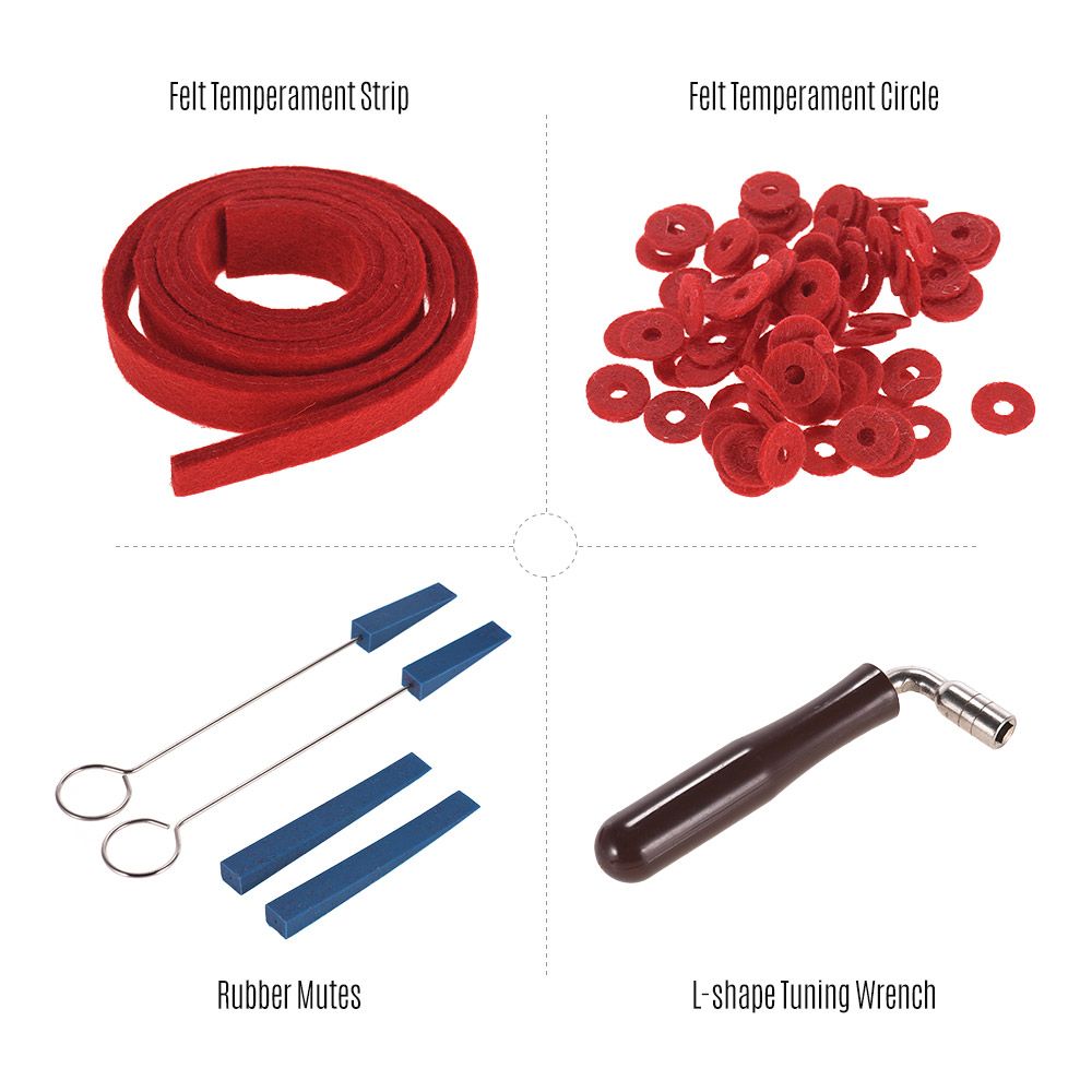 Package comes with 1 wrench hammer, 2 rubber mutes with handle, 2 rubber mutes, 1 felt temperament strip and 1 bag of felt temperament circles (appr. 90ocs) to fully meet your needs.