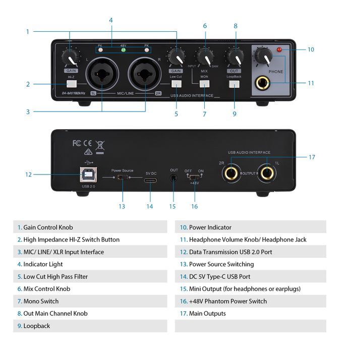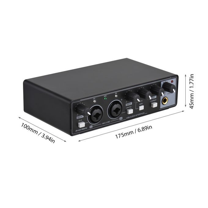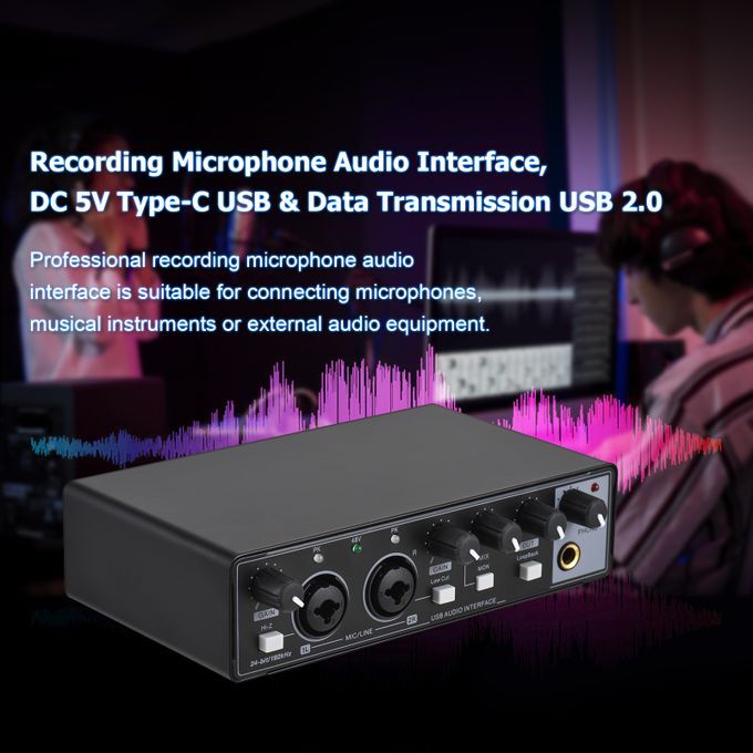 Professional recording microphone audio interface with 24-bit/192KHz sampling rate is suitable for connecting microphones, musical instruments or external audio equipment.