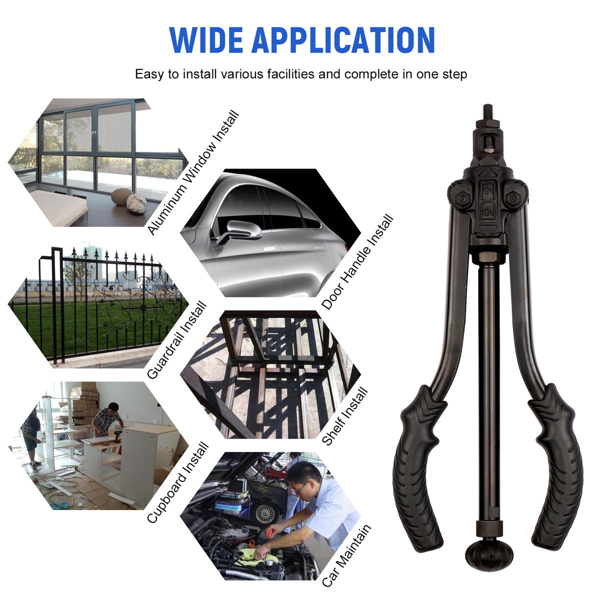 Scop of Application -- The rivet gun kit is ideal for working in hard-to-reach areas. Suitable for metal plate, plastic piece, riveting wood, bicycle attachments, car attachments, furniture, decorations, off-road or Jeep modifications etc.