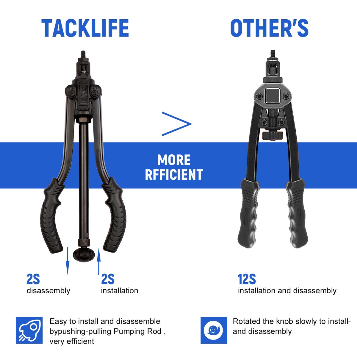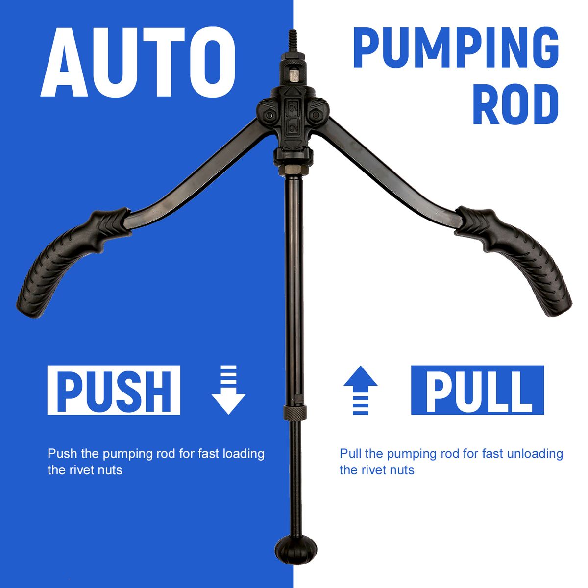 Push Mounting amp; Pull Release -- Auto pumping rod rivet nut tool designed with an pumping rod for fast loading and unloading of threaded rivet nuts. Load rivet nuts by pushing the rod instead of rotation rotating knob. Simply by pulling the rod to unload rivet nuts from the riveter. More Simple, Efficient and Effortless.