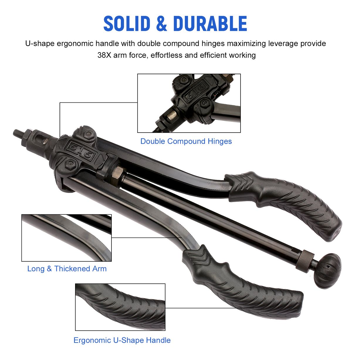 Ergonimic Energy Saving Design -- 14inches rivnut gun, U-shape handles and double compound hinges maximizing leverage which is 60% more efficient in working, labor saving and time saving.